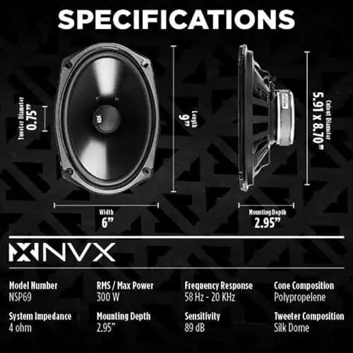 NVX® NSP69 6x9 car speakers are an ideal choice for car owners looking for a high-performance sound system. Thanks to its durable construction and easy installation, you can enjoy it for many years. The package includes a pair (2 pieces) of speakers.