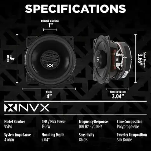 Поднимите свой опыт вождения на новый уровень с премиальными автомобильными динамиками NVX® VSP4 4"! Эти 2-полосные коаксиальные динамики с 1-дюймовыми шелковыми купольными твитерами и интегрированными кроссоверами обеспечивают кристально чистые высокие частоты и мощные басы, создавая богатое и динамичное звучание. С максимальной мощностью 450 Вт и номинальной мощностью 150 Вт они обеспечивают чистое и неискаженное звучание даже на высоких уровнях громкости. Прочный полипропиленовый диффузор и окружающий материал NBR гарантируют долговечную работу. Благодаря конструкции, обеспечивающей простую установку в автомобили, грузовики или двери, монтаж невероятно прост. С глубиной установки всего 2,04 дюйма и вырезаемым отверстием 3,66 дюйма они подходят для большинства автомобилей. Сопротивление 4 Ом и частотный диапазон 100 Гц - 20 кГц обеспечивают широкую совместимость с различными автомобильными аудиосистемами. Независимо от ваших музыкальных предпочтений, NVX VSP4 обеспечивают согласованное и захватывающее звучание для любого жанра музыки. Благодаря высокому качеству звучания, долговечности и простоте установки, премиальные автомобильные динамики NVX VSP4 4" — это превосходное обновление для вашей автомобильной аудиосистемы.
