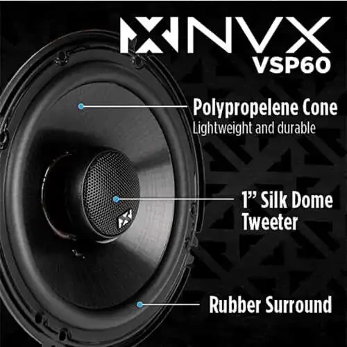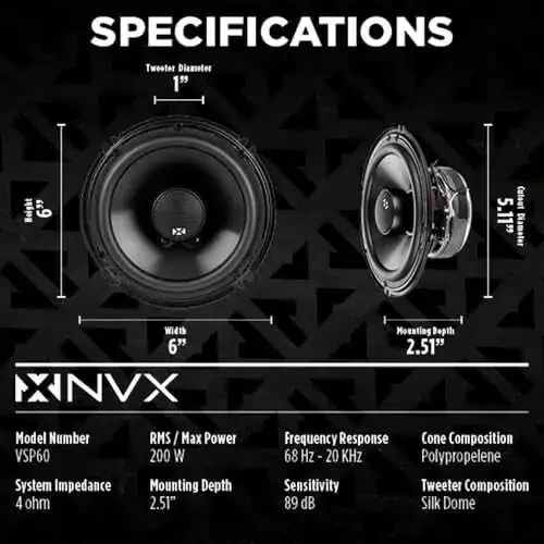Experience superior sound in your vehicle with the NVX® VSP60 6" Premium Car Speakers. With 600W peak power (300W each) and 200W RMS (100W each), these speakers deliver rich and detailed audio. The 1-inch silk dome tweeters and built-in crossovers provide crisp high frequencies and smooth midrange, creating a balanced listening experience. Polypropylene cone material and NBR speaker surround ensure durability and long-lasting performance. The 2.51-inch top-mount depth and 5.11-inch cutout dimensions allow for easy installation in cars, trucks, or doors. 4-ohm impedance and 68Hz - 20kHz frequency response ensure compatibility with various car audio systems, delivering consistent and impressive sound across different music genres. These speakers are a perfect upgrade for music enthusiasts, providing a vibrant and clear sound experience whether on the road or parked. An optional protection plan is available to protect your product from potential damages. This plan covers malfunctions that occur after the manufacturer's warranty, power surges and even drops and spills. 24/7 expert tech support is available to assist you with setup, connectivity issues, and troubleshooting. With a fast and easy claims process, you can file a claim online or by phone within minutes. Plan must be purchased with the product or within 30 days of product purchase.