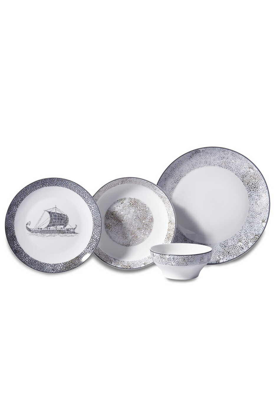В набор входят 12 обеденных тарелок, 12 суповых тарелок, 12 десертных тарелок, 12 чайных чашек, 12 чайных блюдец и 12 вилок, ножей и ложек. Все предметы изготовлены из прочного и высококачественного фарфора и подходят для мытья в посудомоечной машине.