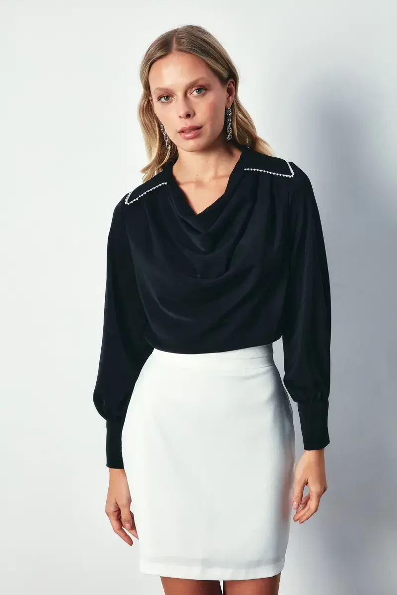 Degaje Yaka Marvaridli Bo'sh Ko'ylak bilan har qanday vaziyatda uslubli va qulay his eting! Qora rangi bilan har qanday kombinatsiyaga osonlikcha mos keladigan bu ko'ylak sizning shkafingizning eng ko'p tanlangan qismlaridan biri bo'ladi.