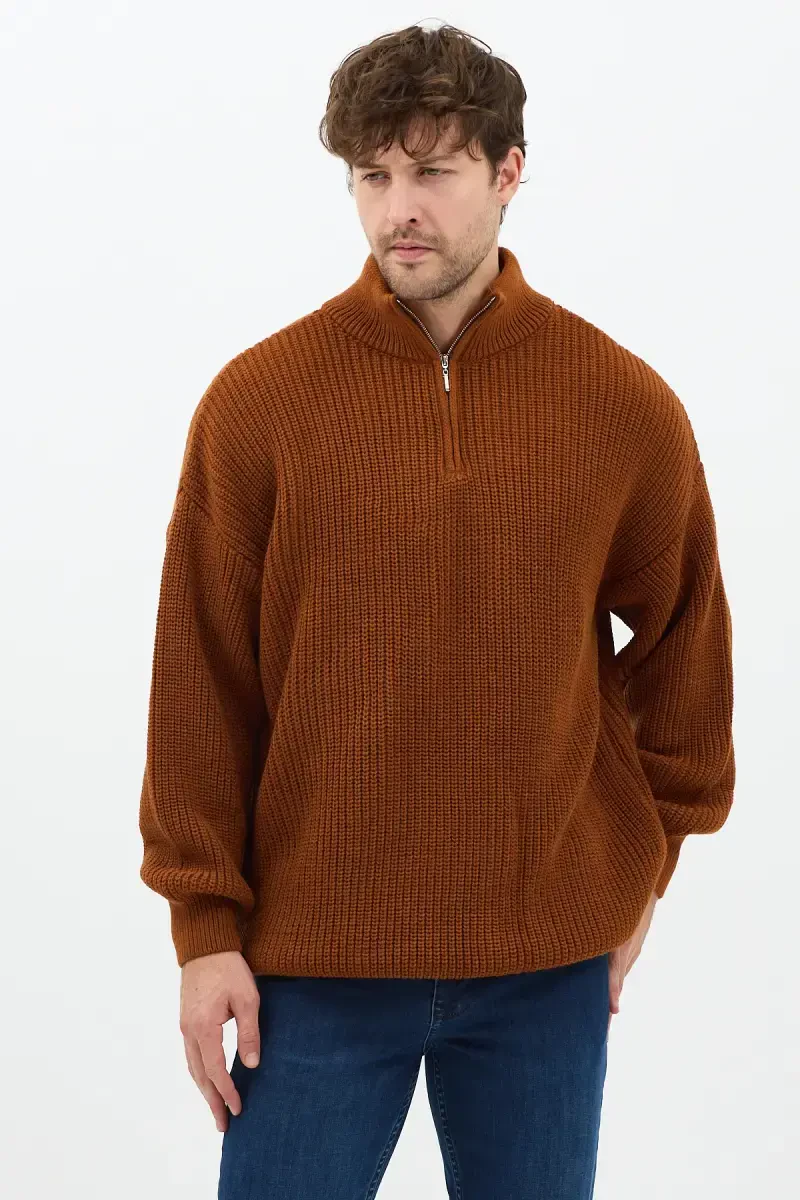 Xantal rangli erkaklar fermuarli baliqchi triko kozok | Oversize qulay hashamat