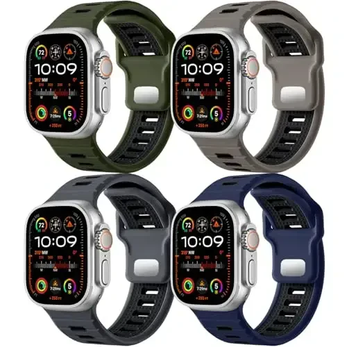 Odbeai 4-Pack Sport Bands, compatible with Apple Watch Ultra 2/Ultra and also fully compatible with Apple Watch Men's Bands. These silicone loop straps, specifically designed for 49mm, 46mm, 45mm, 44mm, 42mm iWatches, offer a seamless match with Series SE 10, 9, 8, 7, 6, 5, 4, 3, 2, and 1 models. Ideal for outdoor sports, these bands are perfect for men seeking both a stylish and durable option. With a wide range of colors and a unique design, they adapt to any activity while making a statement on your wrist. Odbeai sport bands are not just an accessory but also a partner supporting your active lifestyle. They accompany you not only in daily use but also during intense workouts and challenging outdoor conditions. With its waterproof, dustproof, and tear-resistant construction, it offers long-lasting use. Designed with your wrist's comfort in mind, these bands do not irritate your skin and provide a comfortable experience throughout the day. Thanks to its adjustable structure, it fits perfectly on any wrist and offers a secure fit. Whether you're running, hiking, or mountaineering, Odbeai sport bands always accompany you and complete your style. With the 4-pack option, you can have different colors together, allowing you to choose according to your clothes and mood. It is a meaningful gift option for your loved ones on special occasions such as Christmas, New Year's, Father's Day, Valentine's Day, and birthdays. It can be a pleasant surprise for your grandfathers, fathers, and other loved ones.