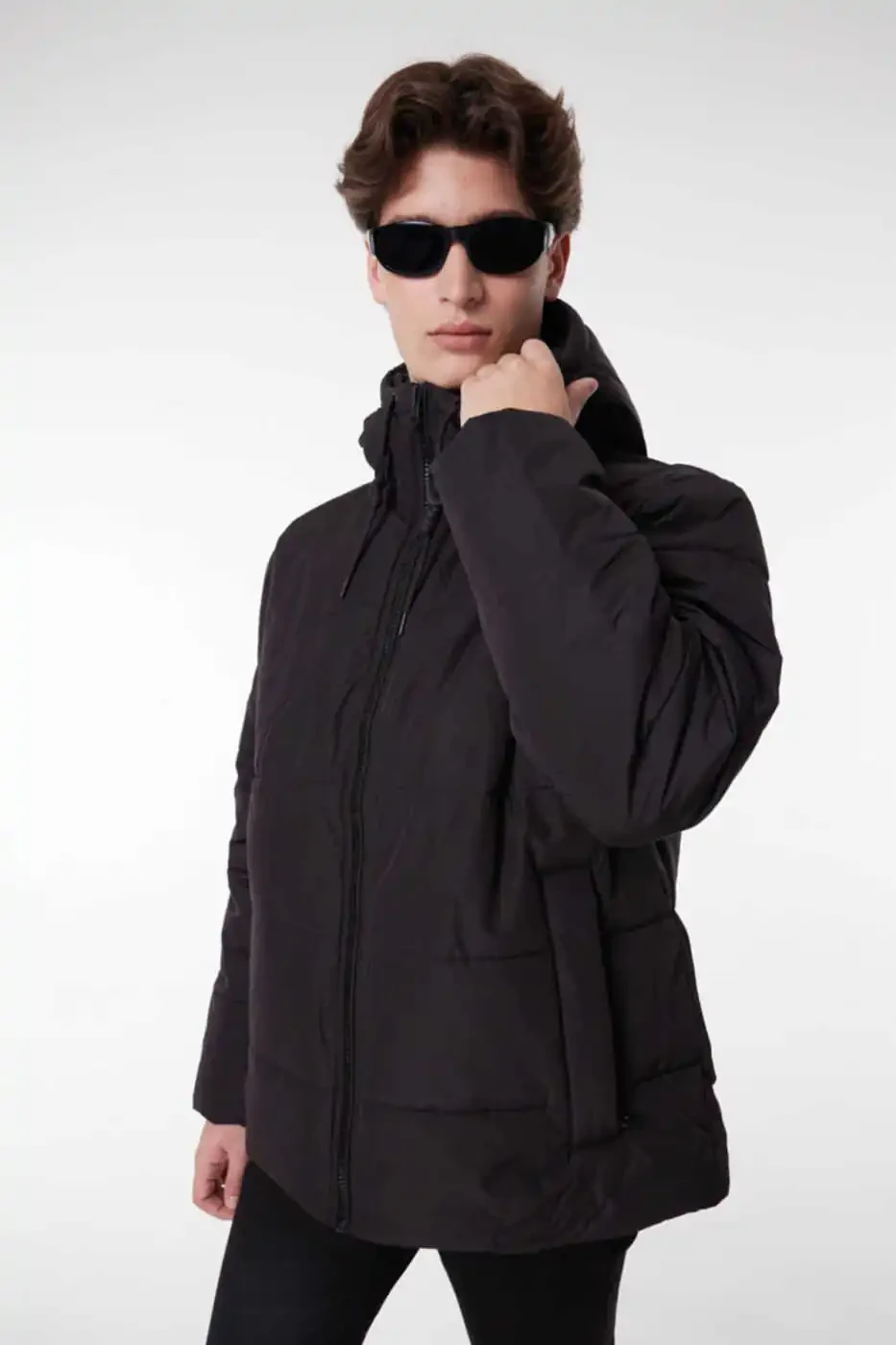 Oddiy Kesim Regular Fit Kaputli Qora Puf Ko'ylagi - Qishda Iliq va Zamonaviy Bo'ling