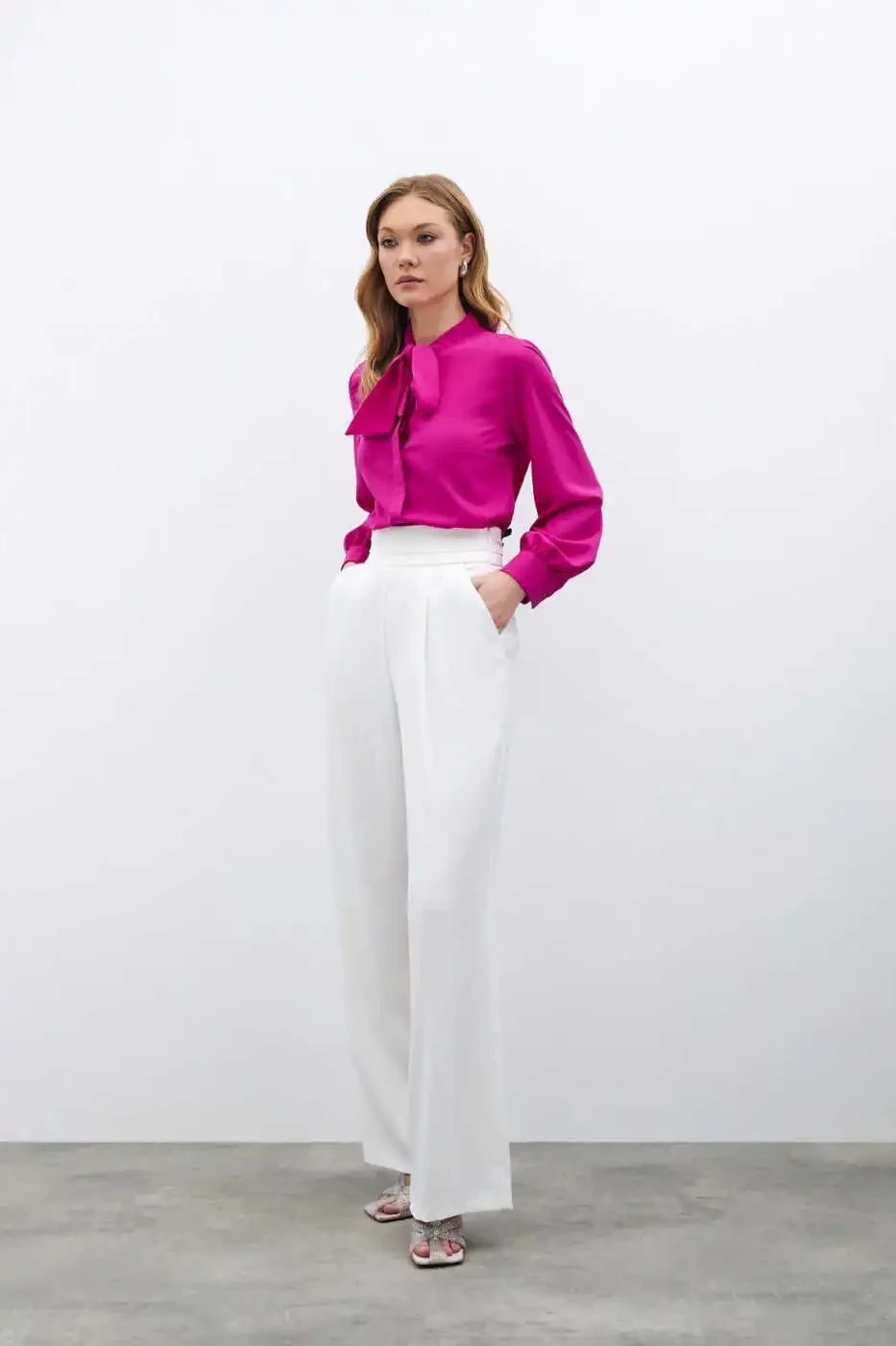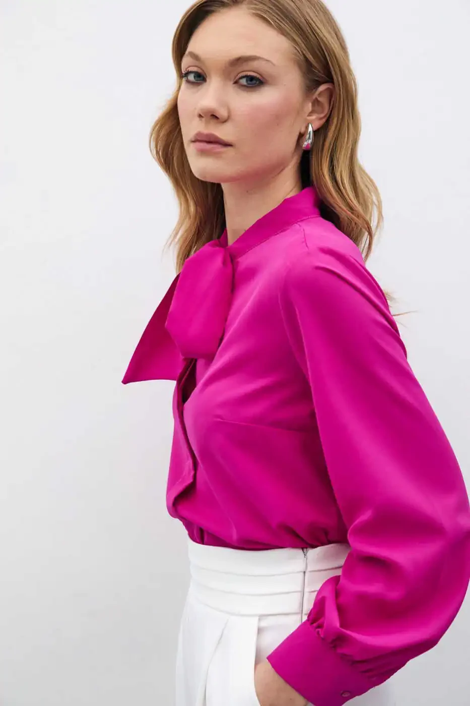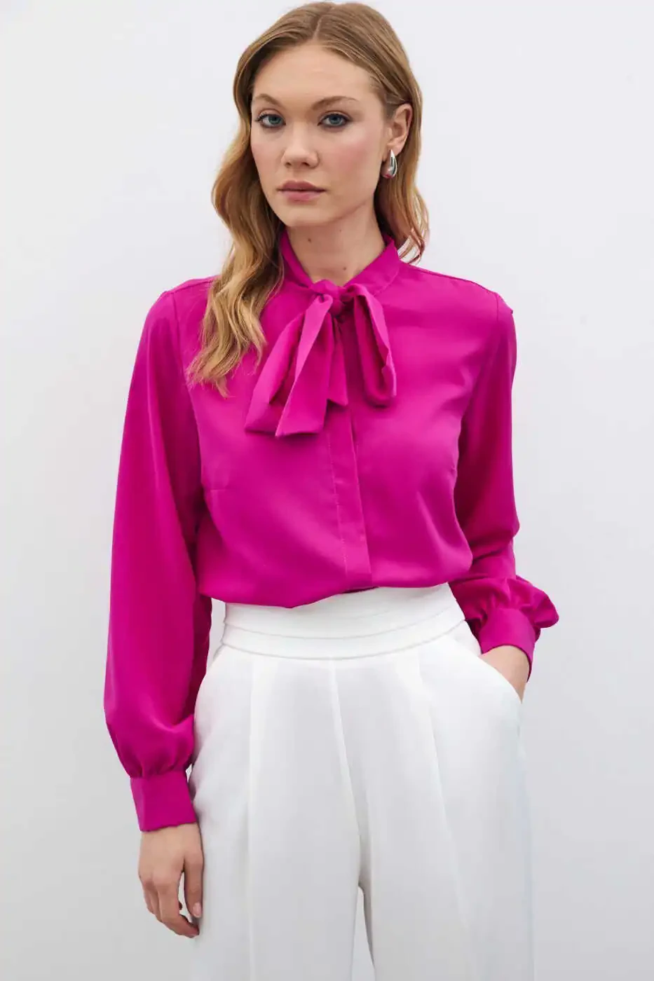Сочетая элегантность и комфорт, блузка с завязками на шее готова стать незаменимой частью вашего гардероба. Блузка, привлекающая внимание своим изысканным завязанным воротником, благодаря своему простому дизайну подходит к любому стилю. Предлагая яркий и энергичный образ своим фуксиевым цветом, блузка станет стильным выбором для особых случаев и повседневных комбинаций.