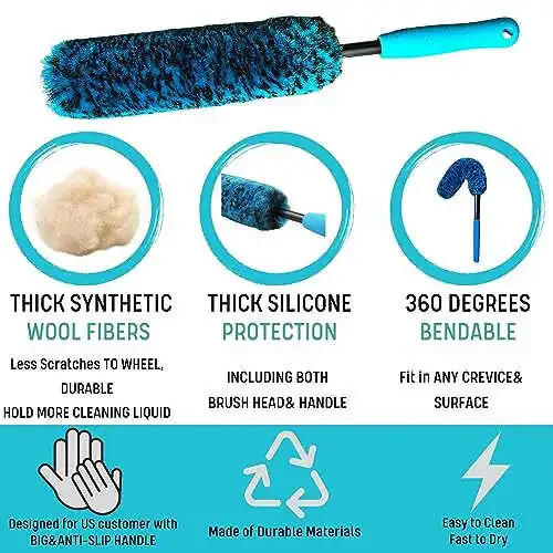 - 2x Yumshoq g'ildirakni tozalash cho'tkasi: Ushbu cho'tkalar nozik g'ildirak sirtlarini chizmasdan tozalash uchun mo'ljallangan yumshoq qililarga ega. Yumshoq qililar chang, axloqsizlik va boshqa qoldiqlarni muloyimlik bilan tozalaydi va g'ildiraklari porlaydi.
