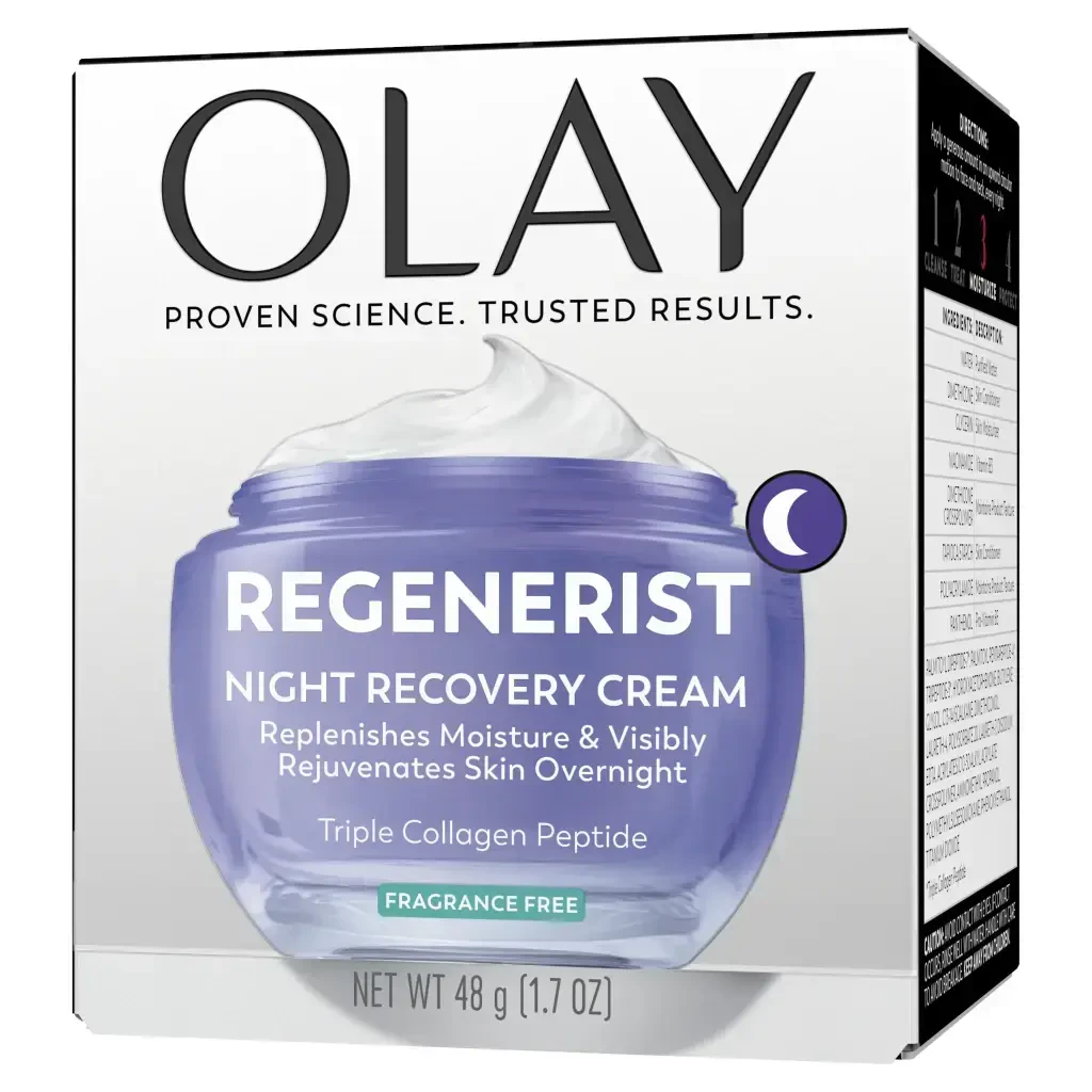 Просыпайтесь с интенсивно увлажненной и более молодой на вид кожей с ночным восстанавливающим кремом для лица Olay Regenerist Night Recovery Cream из коллекции средств по уходу за кожей Advanced Anti-Aging от Olay. Его интенсивное увлажнение действует на протяжении всей ночи, уменьшая видимость тонких линий и морщин. Этот ночной увлажняющий крем имеет сверхгидратирующую формулу с комплексом аминопептидов, проникает на глубину до 10 слоев, восстанавливая поверхностные клетки кожи. Наполняясь увлажняющей силой, он делает кожу упругой, придавая ей ощущение богатства и бархатистости, и отшелушивает ее, способствуя обновлению клеток на поверхности. Гипоаллергенная формула увлажняющего крема против старения не содержит жира и быстро впитывается в поверхность кожи. Без запаха, фталатов, минеральных масел и синтетических красителей.