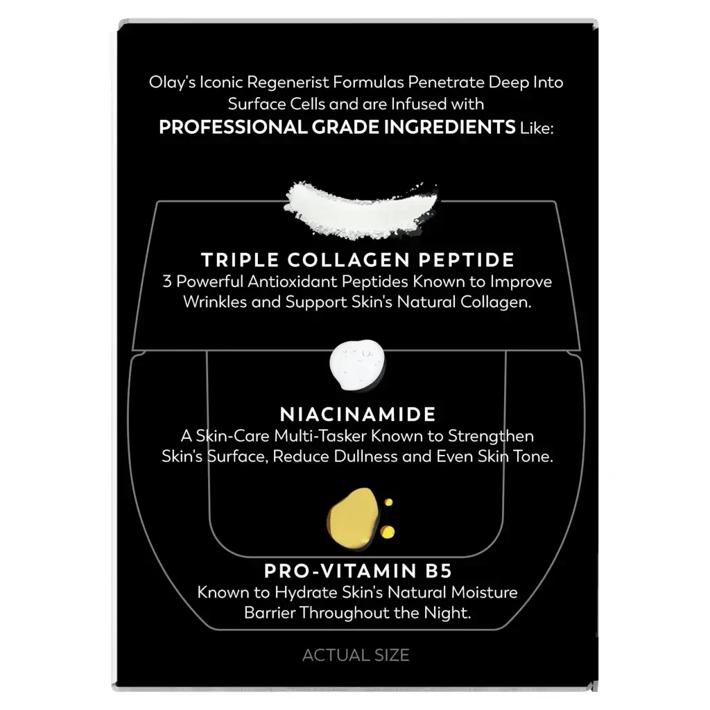 Olayning Advanced Anti-Aging Skin Care Kollektsiyasidagi Olay Regenerist Night Recovery Cream tungi krem yuzini namlash vositasi bilan intensiv ravishda namlangan va yosh ko'rinishga ega teriga uyg'onishga yordam beradi. Uning intensiv namlovchi quvvati butun tun davomida terining namini oshirib, ingichka chiziqlar va qariybliklarning ko'rinishini kamaytiradi. Aminopeptid Kompleksi o'z ichiga olgan bu tungi namlagichning super namlovchi formulasi yuzaning sirtqi qavat hujayralarini qayta tiklash uchun 10 qavatgacha chuqur kirib boradi. Namlanish quvvati bilan to'yingan, u terini boy va mahmaliy his bilan to'ldirib, yuzaki hujayralarning almashinuvida yordam berish uchun piling qiladi. Qariboshga qarshi namlagichning hidsiz formulasi yog'siz bo'lib, tezlik bilan terining yuzasiga singib ketadi. Hid, ftalatlar, mineral moy yoki sintetik bo'yoqlar yo'q.