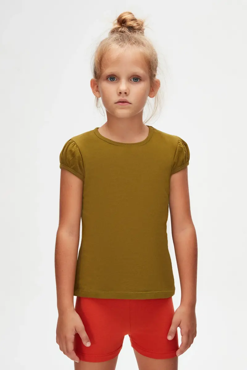Olive Green Basic Girls' Crew Neck Watermelon Sleeve T-shirt-NUTRIA