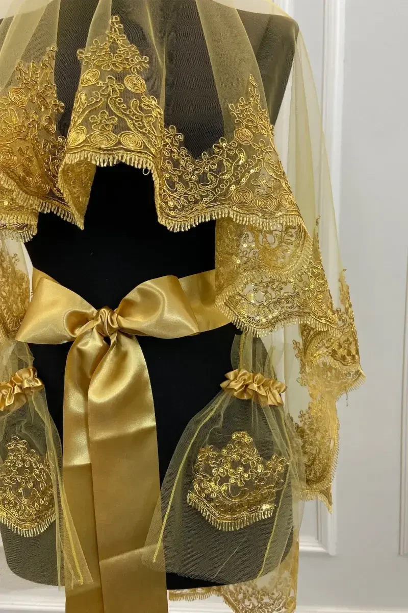 Hayatınızın en özel ve anlamlı günlerinden biri olan kına gecenizde, zarafetinizi ve güzelliğinizi taçlandıracak Gold Işıl Işıl Güpürlü Gelin Kına Duvağı Seti ile unutulmaz bir deneyim yaşayın. Bu muhteşem set, kına gecenizin atmosferine büyüleyici bir dokunuş katarken, sizi adeta bir masal prensesine dönüştürecek. Göz alıcı altın rengi ve zarif güpür detaylarıyla tasarlanan bu set, geleneksel kına gecesi ritüellerine modern bir yorum getiriyor. Her bir parçası özenle seçilmiş kaliteli malzemelerden üretilmiş olup, konforunuz ve şıklığınız ön planda tutulmuştur.Set içerisinde bulunan yüz örtüsü, duvak, kuşak ve eldivenler, birbiriyle mükemmel bir uyum içerisinde tasarlanmıştır. Yüz örtüsü, gizemli ve çekici bir hava yaratırken, duvak, zarafetinizi ve asaletinizi vurgular. Kuşak, belinizi kusursuz bir şekilde sararak siluetinizi ortaya çıkarır ve eldivenler, ellerinize zarif bir dokunuş katar. Altın renginin ışıltısı, üzerinizde adeta bir yıldız gibi parlamanızı sağlayacak ve tüm dikkatleri üzerinize çekecektir.Bu özel set, sadece kına gecenizde değil, düğün fotoğraf çekimlerinizde veya diğer özel etkinliklerinizde de kullanabileceğiniz çok yönlü bir aksesuardır. Gelinliğinizle veya kına kıyafetinizle mükemmel bir uyum sağlayacak, tarzınızı tamamlayacak ve unutulmaz anılar biriktirmenize yardımcı olacaktır. Gold Işıl Işıl Güpürlü Gelin Kına Duvağı Seti, sadece bir aksesuar değil, aynı zamanda bir hatıra, bir sembol ve geleceğe bırakacağınız değerli bir mirastır. Bu özel gününüzde kendinizi özel hissetmek ve unutulmaz bir iz bırakmak için bu seti kaçırmayın. Kına gecenizin büyüsünü artırın, zarafetinizle göz kamaştırın ve bu özel anı ölümsüzleştirin. Gold Işıl Işıl Güpürlü Gelin Kına Duvağı Seti ile hayallerinizdeki kına gecesine adım atın!