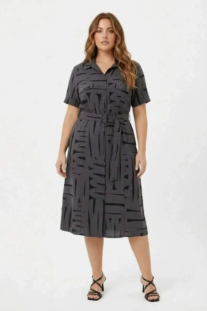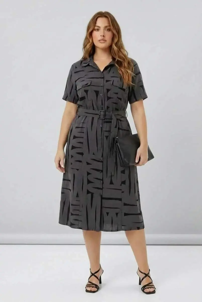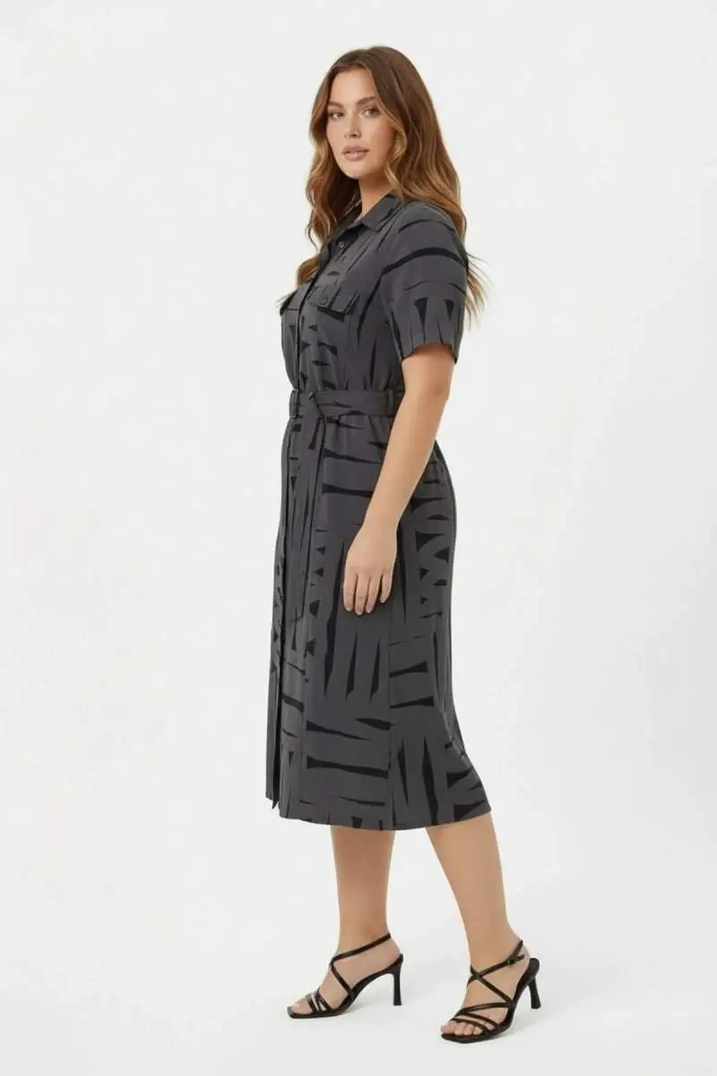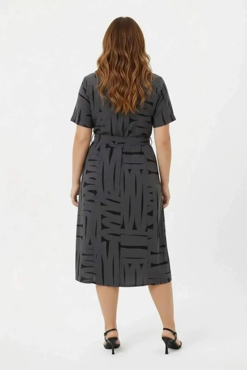 Ön Düğmeli Kuşaklı Büyük Beden Günlük Elbise Füme