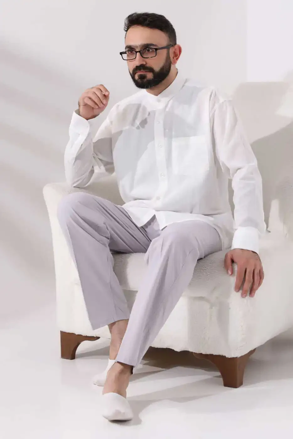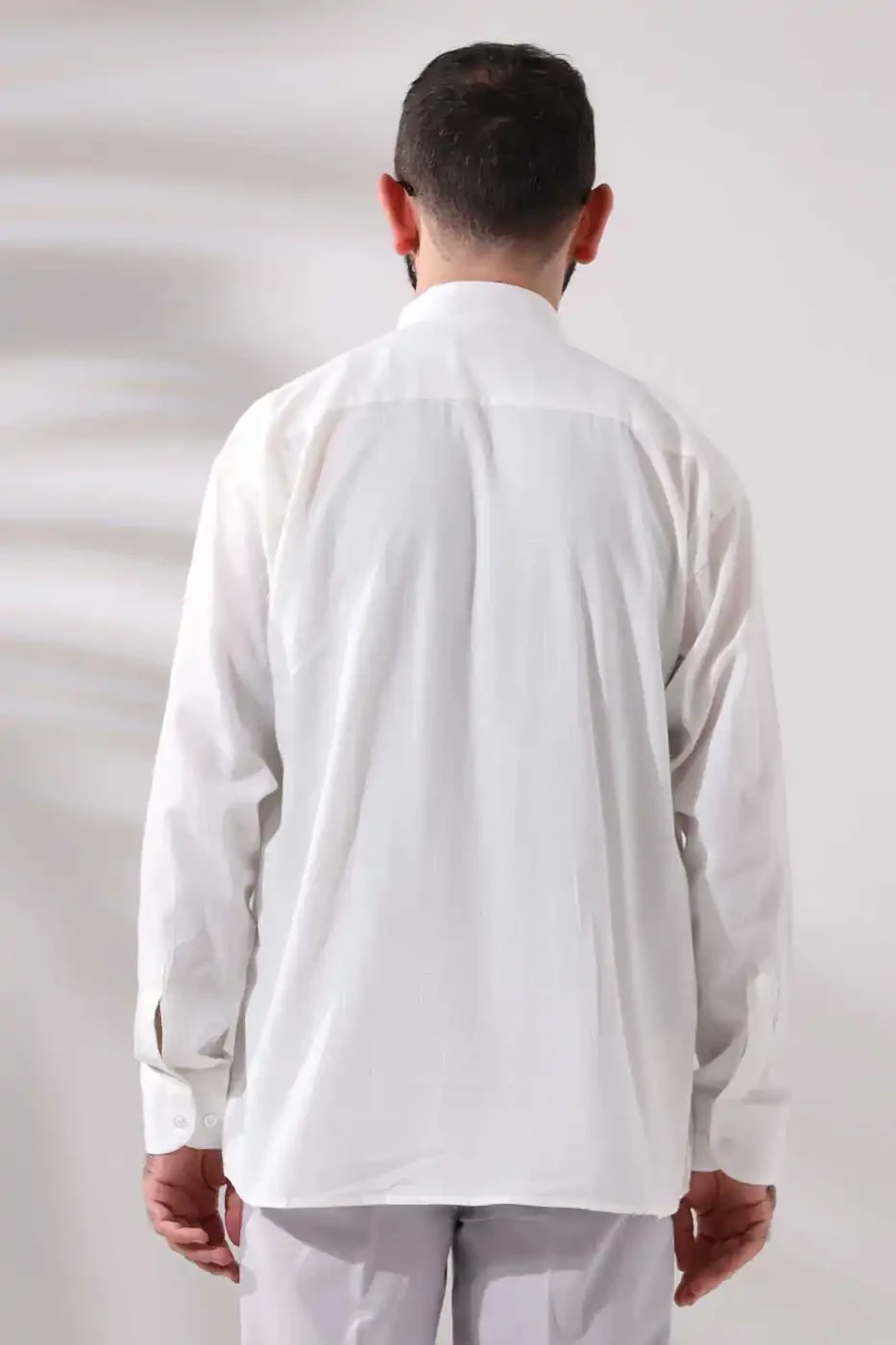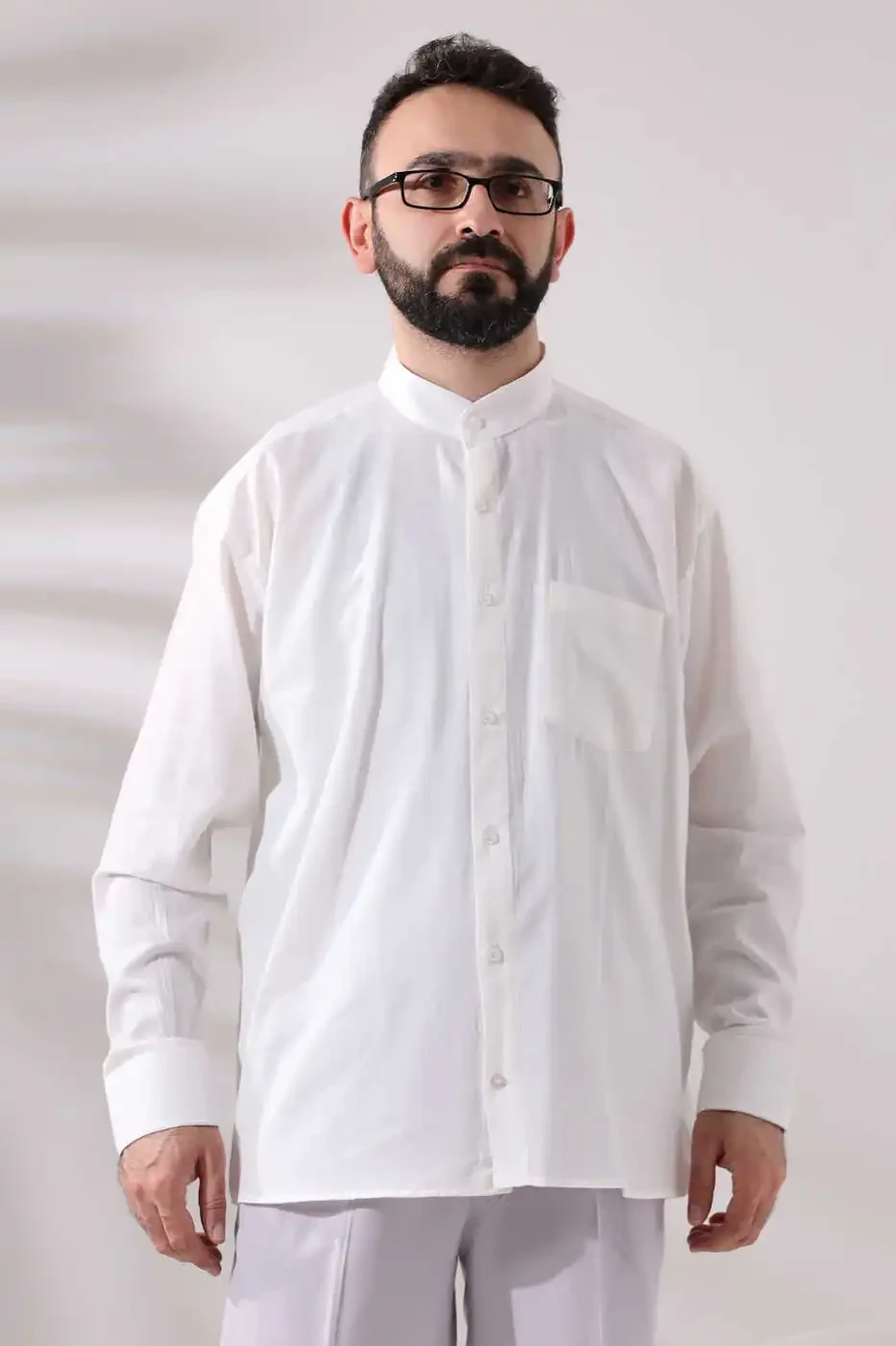 Off-White Men's Mandarin Collar Linen Shirt Hajj and Umrah