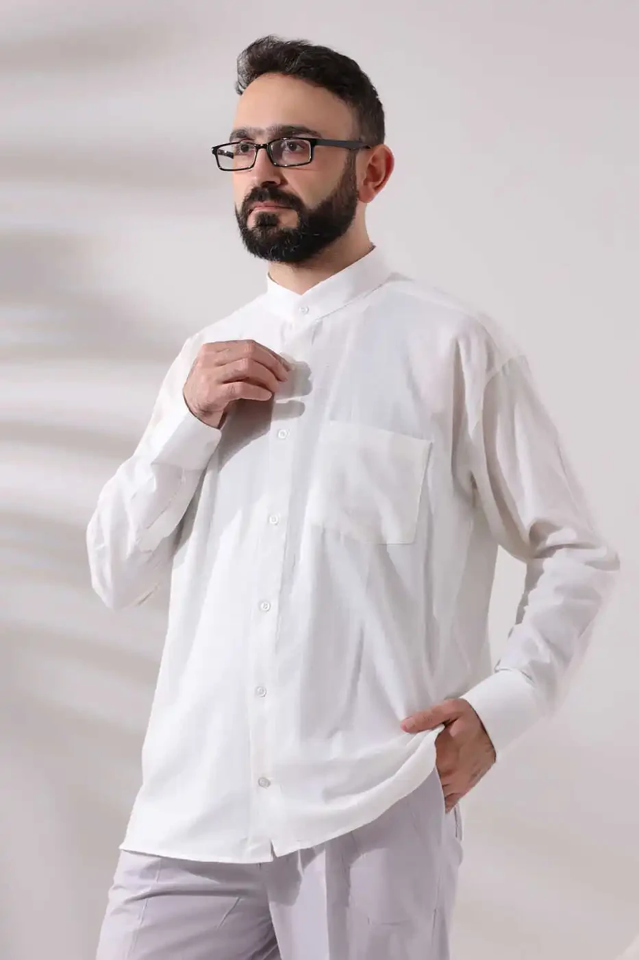 men's linen shirt, mandarin collar shirt, hajj clothing, umrah clothing, off-white shirt, comfortable shirt