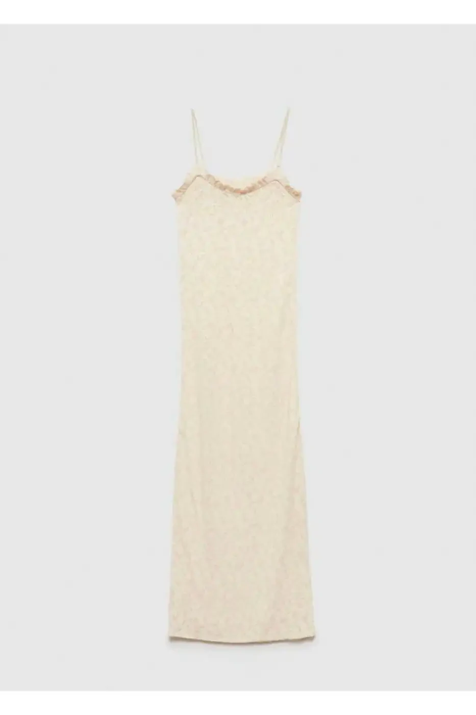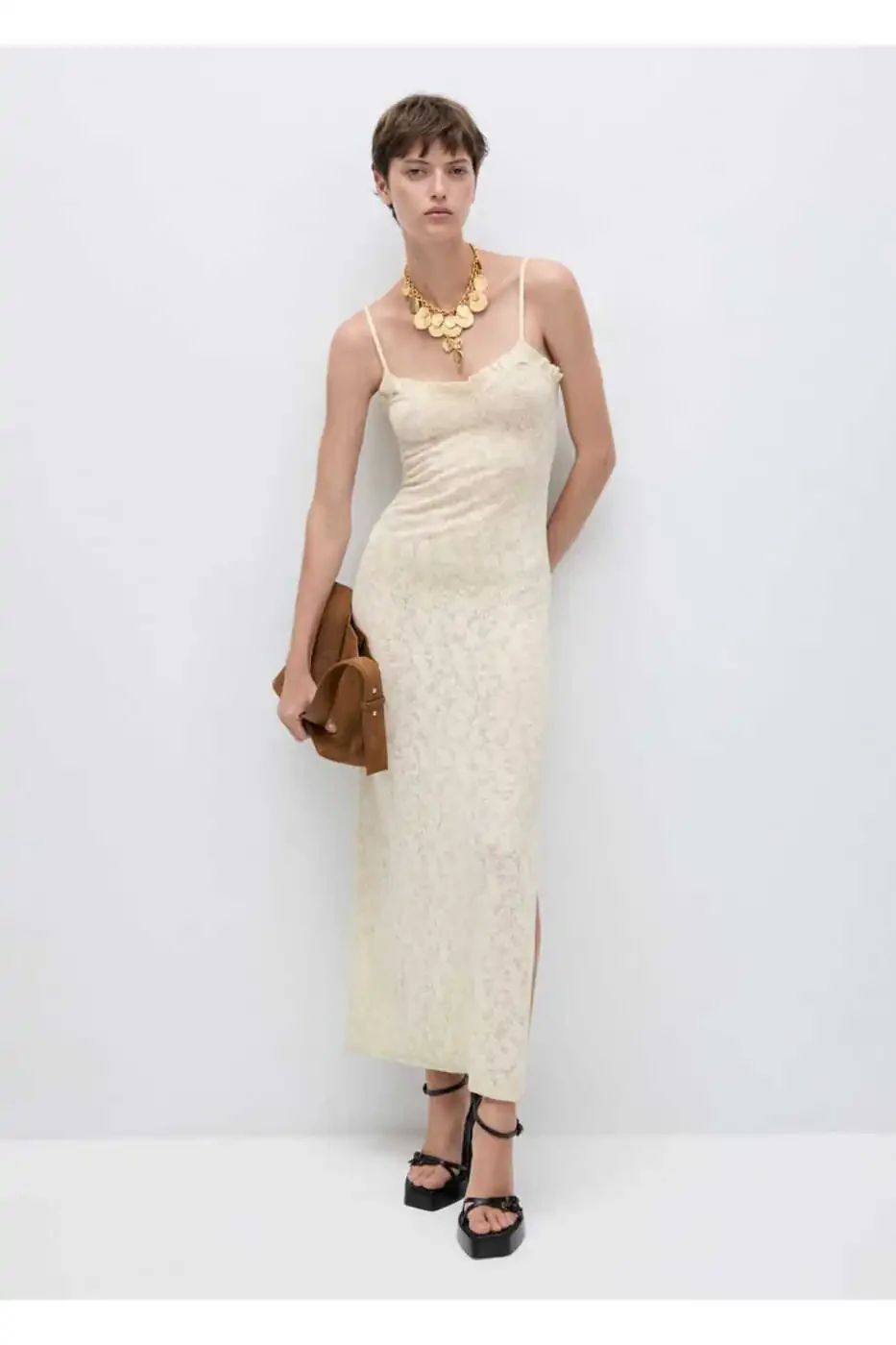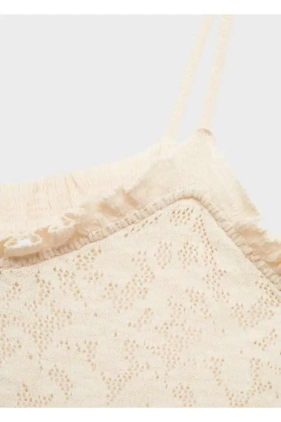 Intricate detailing elevates this crochet-knit dress to a new level of feminine elegance. Crafted from a soft and breathable cotton blend, it features a flattering longline silhouette and a chic scoop neckline. Delicate spaghetti straps and intricate crochet cutouts add a touch of allure, while ruffled edges lend a sense of movement. The fitted design ensures a comfortable and figure-hugging fit.