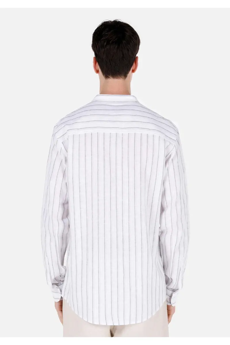Oddiy mos keluvchi mandarin yoqali chiziqli oq erkaklar uchun uzun yengli ko'ylak: Stil va konforning uyg'unligi