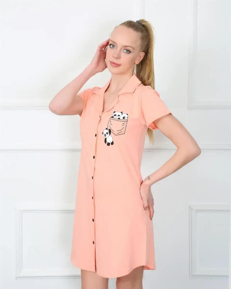 Akbeniz Pushti Tunika Tungi Ko'ylak | Oldi Tugmachali Paxtali Ayollar Uy Kiyimi
