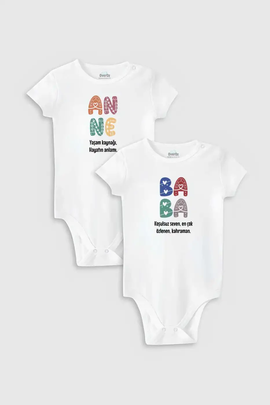 With the Organic 100% Cotton Mother Father Printed 2-Piece Baby Bodysuit Set, you can offer the gentlest touch to your baby's skin while achieving a stylish and meaningful look. This special set is made of 100% organic cotton, considering your baby's sensitive skin. Thanks to its soft texture, your baby will be comfortable all day long, and the risk of allergic reactions will be minimized. The two snap-buttoned bodysuits in the set make life easier for mothers with their practical use. Thanks to the snap fasteners, dressing and undressing can be done quickly and smoothly. Mother and father themed prints make this bodysuit set both cute and meaningful. These prints, which symbolize your baby's bond with his family from the moment he was born, are a great option for special occasions or daily use. Prints made with organic dyes maintain their permanence for a long time and do not harm your baby's health. This set, carefully prepared by OverOz Baby, has high quality standards. During the production stage of our products, the shrinkage rate of 100% cotton fabric is taken into consideration, thus preventing dimensional changes after washing. Our prints made with GOTS (Global Organic Textile Standard) certified dyes are the safest option for your baby's health. In this way, you can be sure that every material that touches your baby's skin is natural and harmless. White color offers easy combination with all clothes, while providing a stylish and simple look. The duo set ensures that you always have a ready-to-use option in your wardrobe. Designed with your baby's comfort and health in mind, this bodysuit set can also be a stylish and cute gift alternative. You can consider it as a meaningful gift option that will make parents happy at newborn baby visits or baby showers. Add a healthy and stylish touch to your baby's wardrobe with the Organic 100% Cotton Mother Father Printed 2-Piece Baby Bodysuit Set.