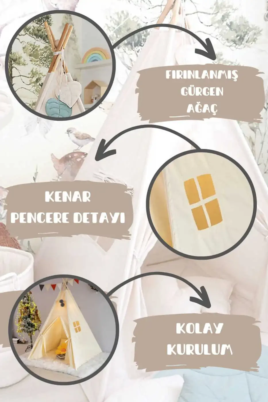 Meet the Organic Cotton Fabric Teepee Kids Play Area & Tent, which ignites your children's imagination and offers a play experience intertwined with nature! This specially designed tent offers your children not only a play area, but also a magical world where they will collect unforgettable memories and create their own fairy tales. With its sturdy hornbeam wood poles and organic cotton fabric, it is both a safe and environmentally friendly option. The teepee design enriches children's imaginations and offers them the opportunity to discover different cultures. This tent, which is suitable for indoor or garden use, will make your children's playtime more fun and creative. The Peaceful Nature Fairy Tale Tent is carefully designed to ensure that your children are safe while playing. The kiln-dried hornbeam wood poles guarantee the tent's strength and durability, while the organic cotton ranforce fabric provides a soft touch without harming children's sensitive skin. The 150 cm long poles and 135 cm high assembled tent provide children with a large play area, allowing them to move freely. The full bottom cushion creates a comfortable seating area during play and relaxation. This special tent is not just a toy, but also a tool that contributes to children's development. It helps them create their own game scenarios using their imaginations, improve their role-playing skills and socialize. The Organic Cotton Fabric Teepee Kids Play Area & Tent is an unforgettable gift option that will allow your children to have fun and learn. This tent, which is sent carefully packaged and assembled, can be easily installed and is ready for immediate use. Don't miss this opportunity to make your children's dreams come true and offer them a peaceful play area intertwined with nature.