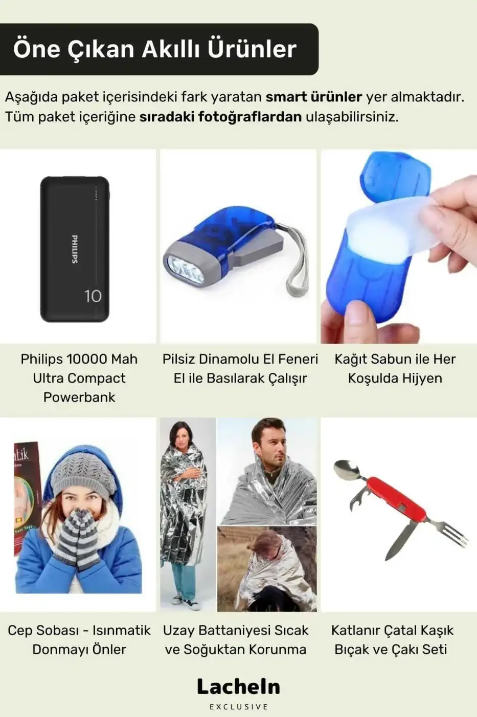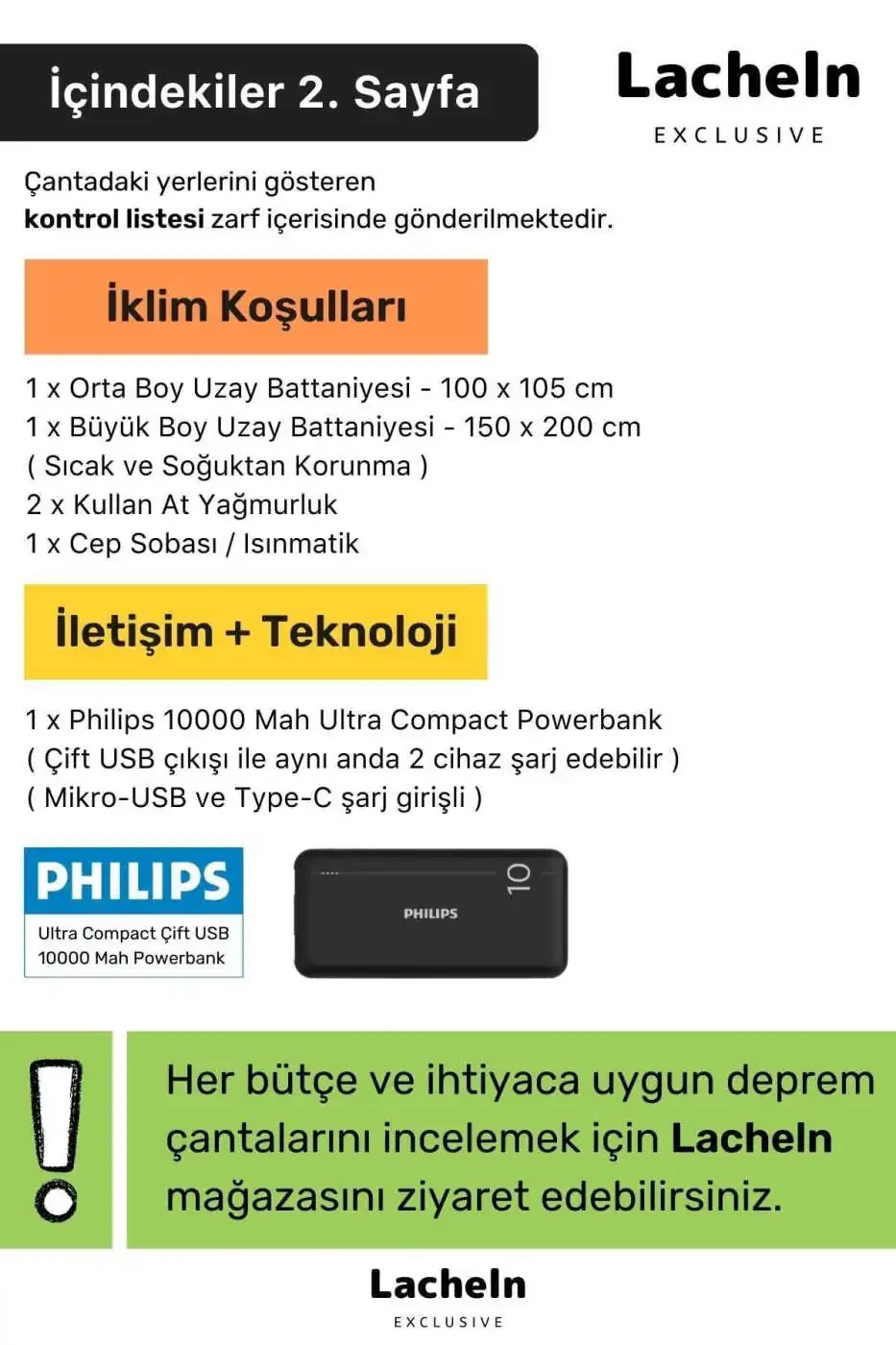 Bu ürün Lacheln - Hazır Deprem Çantası Paketleri tarafından gönderilecektir.Kampanya fiyatından satılmak üzere 100 adetten fazla stok sunulmuştur.İncelemiş olduğunuz ürünün satış fiyatını satıcı belirlemektedir.Bir ürün, birden fazla satıcı tarafından satılabilir. Birden fazla satıcı tarafından satışa sunulan ürünlerin satıcıları ürün için belirledikleri fiyata, satıcı puanlarına, teslimat statülerine, ürünlerdeki promosyonlara, kargonun bedava olup olmamasına ve ürünlerin hızlı teslimat ile teslim edilip edilememesine, ürünlerin stok ve kategorileri bilgilerine göre sıralanmaktadır.Bu üründen en fazla5 adet sipariş verilebilir.5 adedin üzerindeki siparişleri Trendyol iptal etme hakkını saklı tutar.Belirlenen bu limit kurumsal siparişlerde geçerli olmayıp, kurumsal siparişler için farklı limitler belirlenebilmektedir.15 gün içinde ücretsiz iade. Detaylı bilgi için[page="return_conditions"]tıklayın .Orijinal Lacheln Exclusive All-In-One Maxi Power Paket Hazır Deprem ÇantasıAll-In-One Konsept: İlk Yardım Sağlık + Hijyen Temizlik + Yaşam + İklim + İletişim - Teknoloji konsepti deprem ürünleri ile doludur.Deprem sonrasındaki ilk 72 saati güvenle geçirmeniz için tasarlanmıştır.Çanta içeriğinde yer alan TÜM ÜRÜNLERİ FOTOĞRAFLARDA bulabilirsiniz.Power Enerji İçeriği: Philips Ultra Compact Çift Usb Çıkışlı 10000 Mah PowerbankLacheln Maxi Deprem Paketi İçerisindeki Özel Smart ( Akıllı ) Ürünlerden Bazıları: Pilsiz Dinamolu El Feneri + Cep Sobası / Isınmatik + Kağıt Sabun + Çatal Kaşık Bıçak Çakı Seti + Büyük Boy Uzay Battaniyesi 150 x 200 cm. ( Sıcak ve Soğuktan Korunma )Su Geçirmez 65 LT ( 55+10 ) Körüklü Ortopedik Destekli Yükü Hafifleten Orijinal Lacheln marka Körüklü Sırt Çantası ile gönderilmektedir.4 Kişiye kadar aile boyu kullanılabilir. Çanta %35 oranında doludur.Boş olan %65'lik kısmına kişi sayısına göre kişisel eşyalarınızı eklemeniz yeterlidir.Çanta içerisinde içerik listesi ve kişisel olarak sizin eklemeniz gerekenler listesi gönderilmektedir.Uzun süre beklemeye dayanıklı kaliteli deprem ürünleriyle doludur.Çanta Doluluk Oranı %35 - Boş kısma kişisel eşyalarınızı koyarak çantanızı kişiselleştirebilirsiniz.Deprem Çantası NEDEN KIRMIZI DEĞİL?Çantanın SİYAH olma sebebi deprem anında bu çanta ile dışarı çıktığınızda içinde değeri yükselmiş olan deprem ürünleri olduğunun dışarıdan anlaşılmamasını sağlamak ve gasp edilmesini önlemektir.Amerika ve Japonya gibi deprem konusunda tecrübeli ülkelerde siyah deprem çantaları kullanılmaktadır.Baştan aşağı kendi deprem çantanızı oluşturmak yerine Profesyonel ve Hazır deprem çantası alıp ardından bu çantayı kişiselleştirmeniz uzmanlar tarafından önerilmektedir.Lacheln deprem çantalarında kişisel olarak edinmenizin oldukça zor olduğu profesyonel deprem ürünleri bulunmaktadır.Her bütçe ve ihtiyaca uygun Orijinal Lacheln Deprem paketlerini incelemek için Lacheln Türkiye mağazasını ziyaret edebilirsiniz.Evde, arabada, okulda ve iş yerinde bulundurabileceğiniz Lacheln Exclusive deprem sırt çantası ile her yerde güvendesiniz.