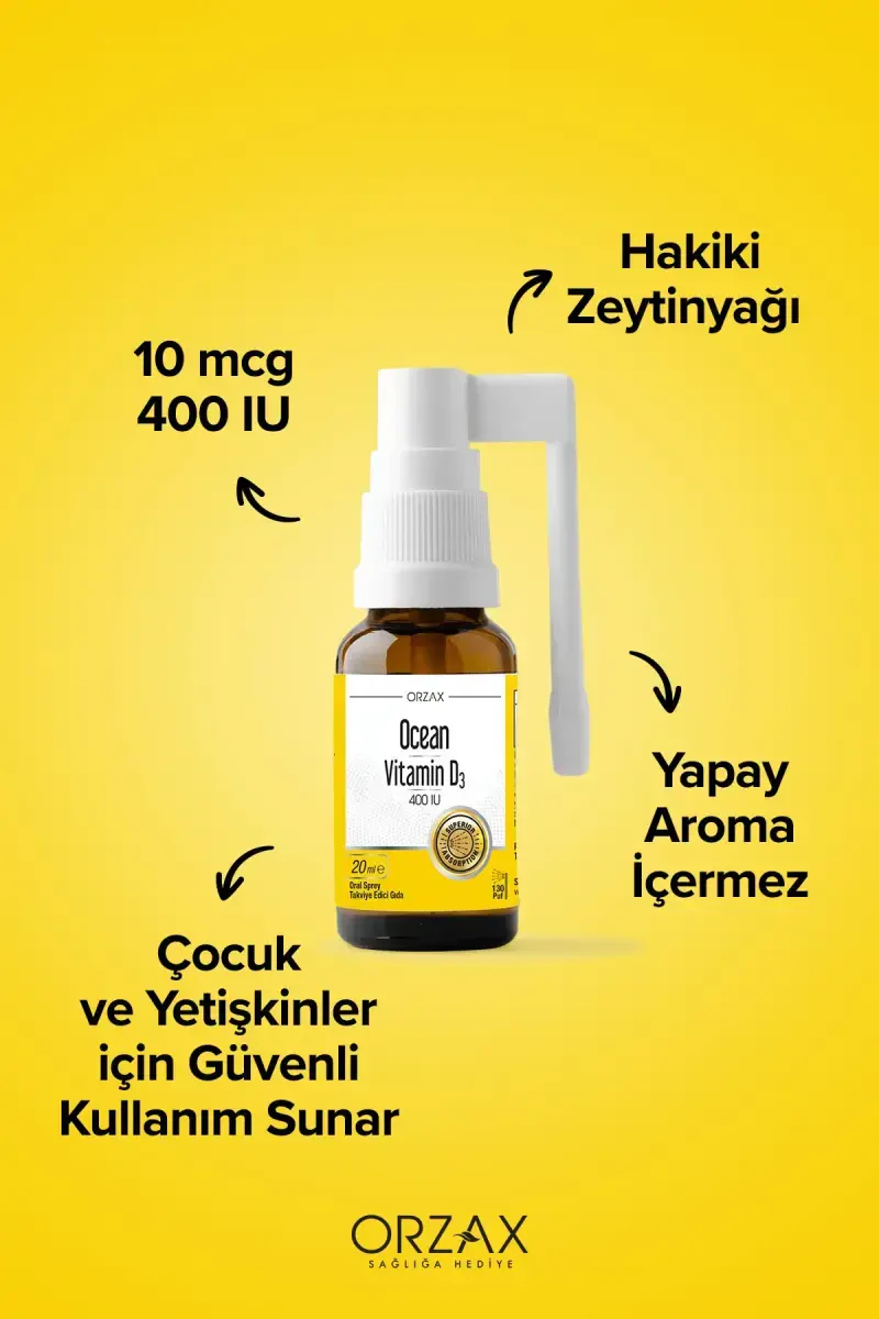 Orzax Vitamin D3 400 IU Sprey yuqori sifatli va ishonchli tarkibi bilan sog'lig'ingiz uchun eng yaxshi echimni taklif etadi. Quyosh kuchini har joyda o'zingiz bilan olib yurish uchun Orzax Vitamin D3 400 IU Spreyni tanlang.