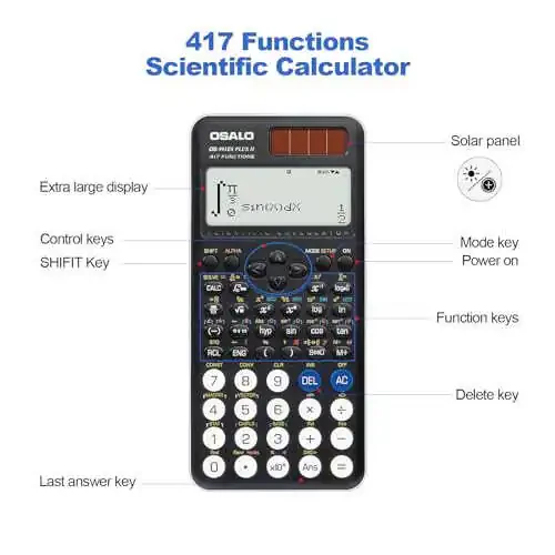 * 417 ilmiy funksiya bilan jihozlangan OSALO hisoblagichi sizga algebra, trigonometriya, statistika va hisobdan tortib juda ko'p turdagi matematik amallarni bajarish imkonini beradi.