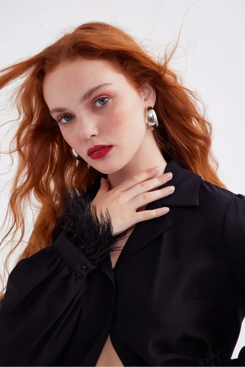 Ostrich Feather Detail Black Shirt | Loose and Stylish