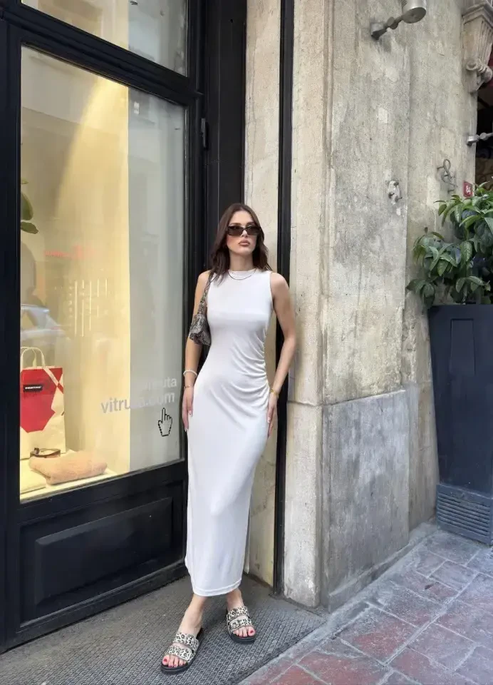 Osy Modal Soft Touch Fabric Crew Neck Sleeveless Slit Long Dress - White is a special design that brings together elegance and comfort. Thanks to the softness and comfort of modal fabric, it offers a pleasant use all day long. Crew neck and sleeveless design allows you to achieve a modern and elegant look. The slit detail adds movement to the dress while highlighting your elegance. This dress, which adapts to any environment with its white color, will be an indispensable part of your wardrobe. The model's measurements and size information on it help you choose the right size.