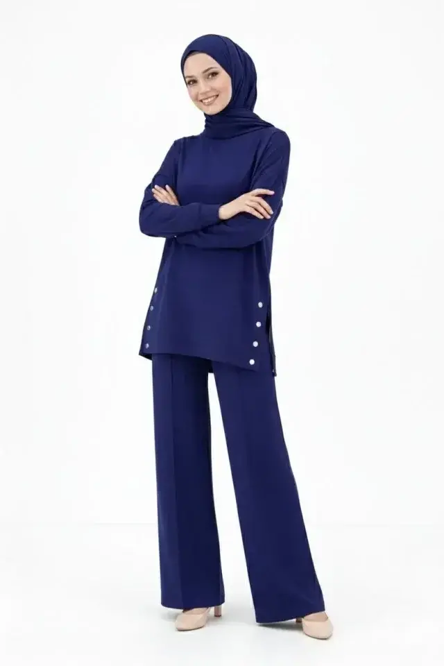 Osy Modal Yumuşak Dokulu Kumaş Modern Tesettür Takım Yandan Metal Çıtçıtlı Uzun Tunik Pantolon Set Salaş Kalıp - Lacivert