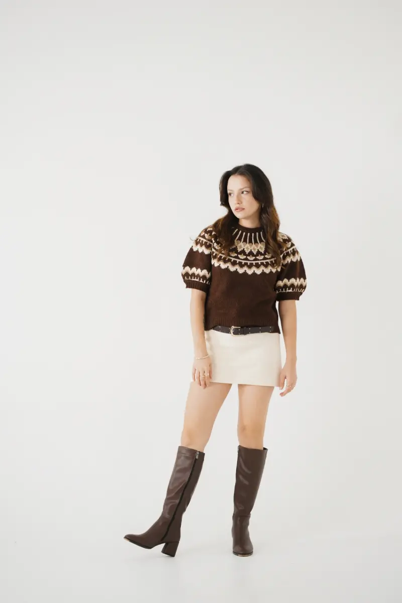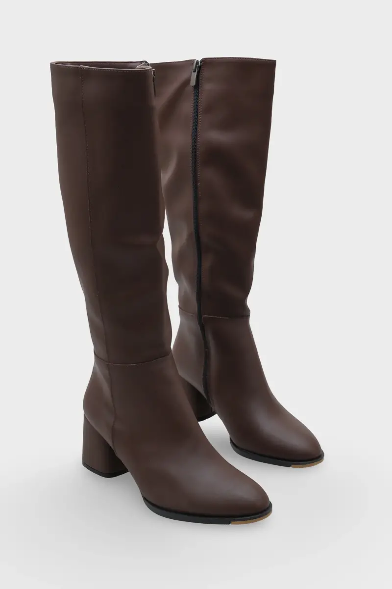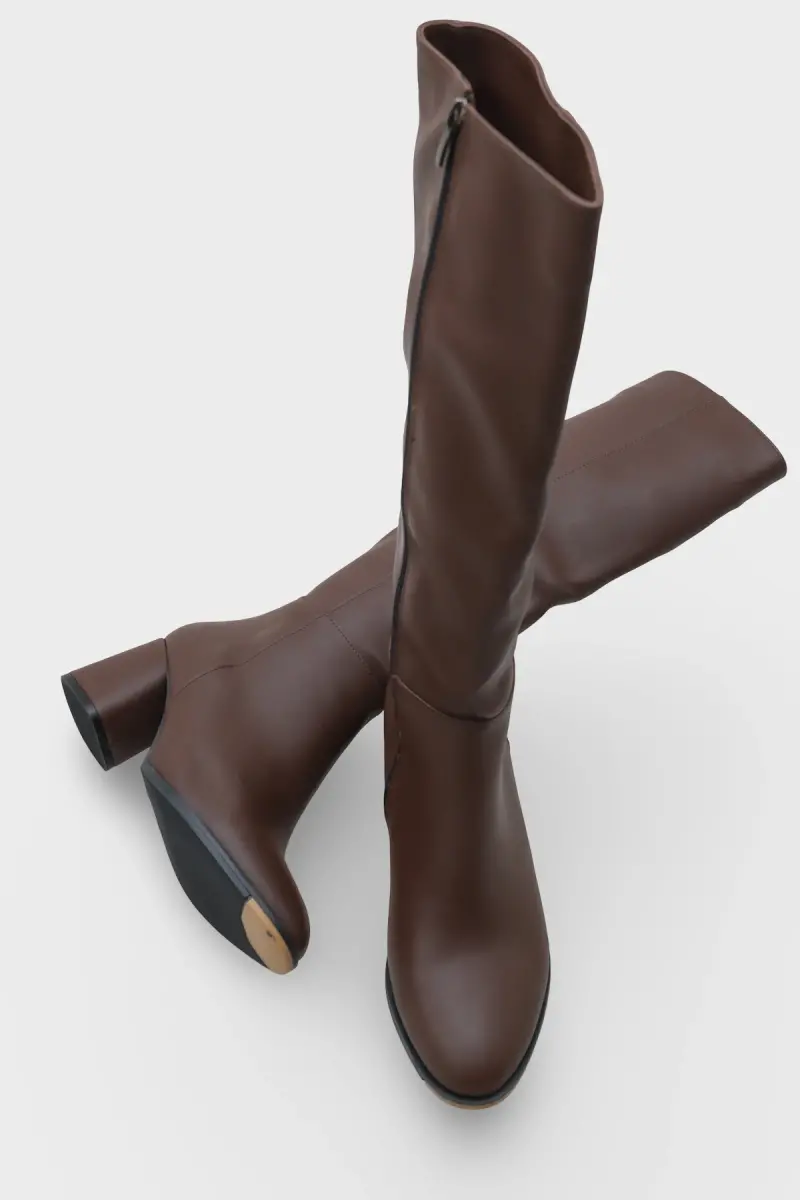 Oval Burunlu Yandan Fermuarlı Kahve Topuklu Kadın Çizme-Kahve