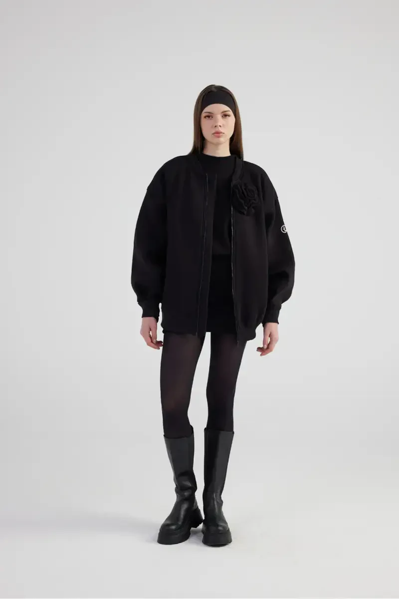 Elevate your style with the Oversize Detachable Rose Detail Lined Alexa Bomber Jacket in Black. This unique design is poised to become an indispensable part of your wardrobe by offering both comfort and elegance. Made from a blend of 65% cotton and 35% polyester, this jacket provides a comfortable wearing experience all day long. The quality of the fabric ensures long-lasting use, while the lined construction adds an extra layer of comfort to the inside of the jacket.An ideal choice for transitional seasons with its long-sleeved design, the Alexa Bomber Jacket perfectly complements any outfit with its simple and stylish look. Its plain pattern can be easily paired with different styles, while its oversize fit offers a modern and trendy appearance. Whether for everyday wear or a special event, you can always be stylish and eye-catching with this jacket.Suitable for business environments, this jacket adds an elegant touch to your professional style. The zippered collar detail allows the jacket to be easily put on and taken off, while also providing a stylish look. One of its most striking features, the detachable rose details, add a feminine and elegant touch to the jacket. Thanks to these details, you can add a personal touch to your style and achieve different looks with different combinations.Appealing to all age groups, this design appeals to a wide range of users. The double-pocket structure offers practical areas where you can safely store your small items. Ideal for your keys, phone, or wallet, these pockets enhance the functionality of the jacket. The woven fabric type increases the durability of the jacket, allowing for long-term use.As part of the basic collection, the Alexa Bomber Jacket, a timeless piece, is an investment that is always in fashion and will remain in your wardrobe for many years to come. Offering freedom of movement with regular length and fit options, this jacket is designed to fit every body type. Thanks to its oversize fit, you can achieve both a comfortable and stylish look. This jacket is not just a piece of clothing, but also a style statement. Reflect your style and make a difference in any environment with the Oversize Detachable Rose Detail Lined Alexa Bomber Jacket in Black.