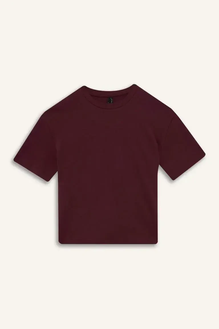 Oversize tişört, bisiklet yaka, bordo tişört, pamuk tişört, kısa kollu, basic tişört, rahat tişört, geniş kalıp, trend tişört, günlük tişört