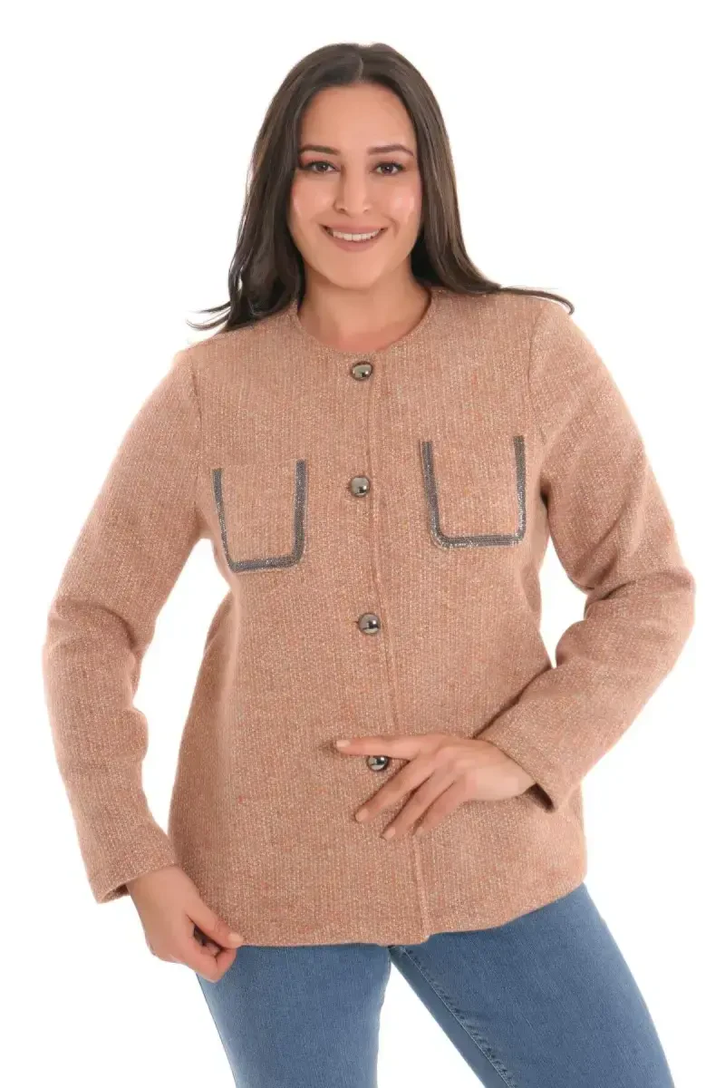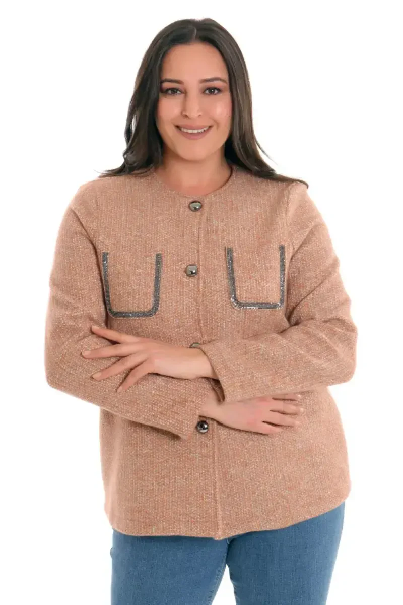 The Plus Size Pocket Stone Embroidered Camel Jacket offers a stunning combination of soft fabric and a simple yet chic design. It presents a sporty look with button and side pocket details. Its unique cut and sharp modern texture will make you feel stylish and accompany your outfits throughout the day.