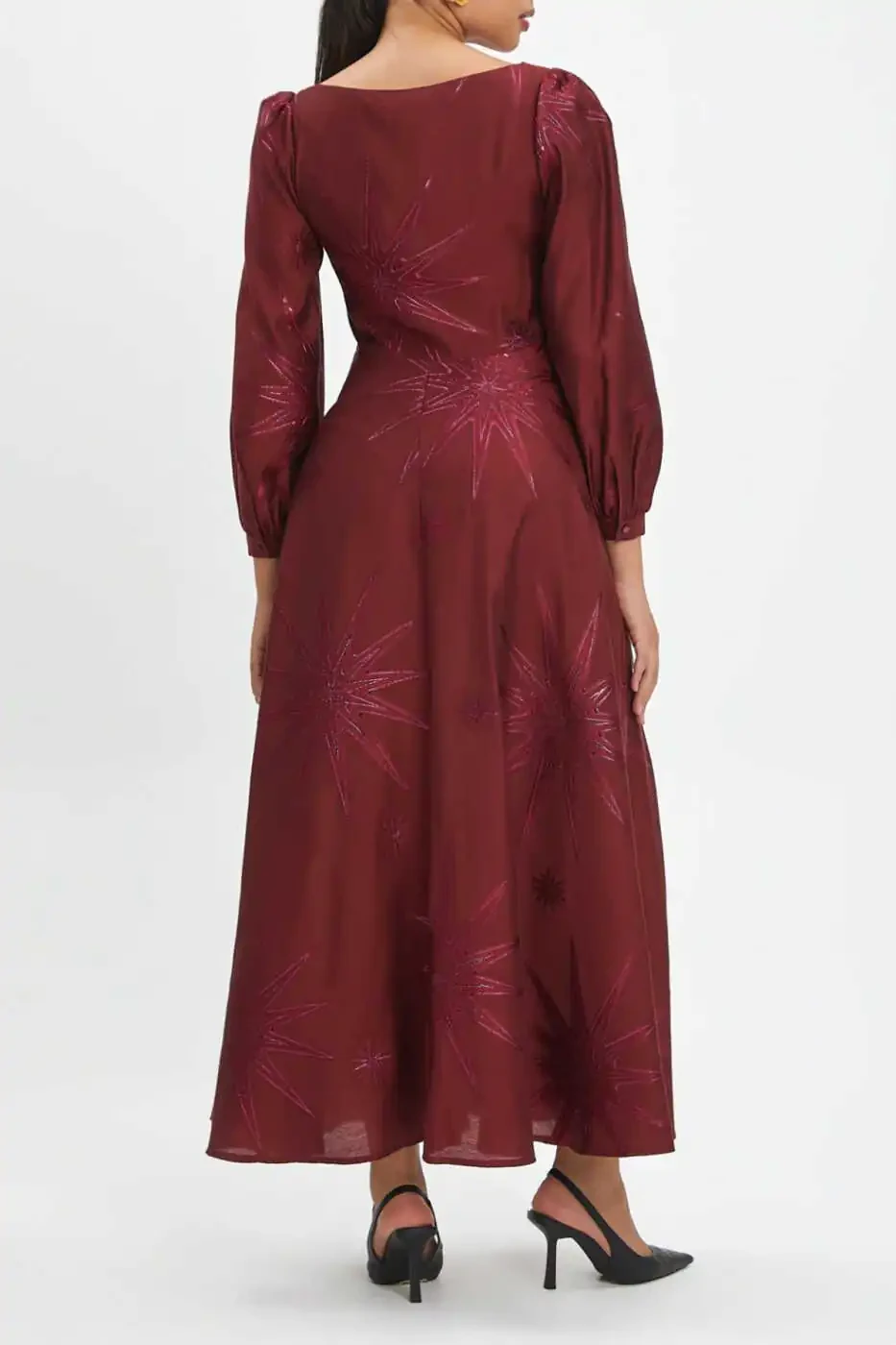 O'zingiz naqshli velosiped yoqali klosh yubkali bordo ko'ylak 40345