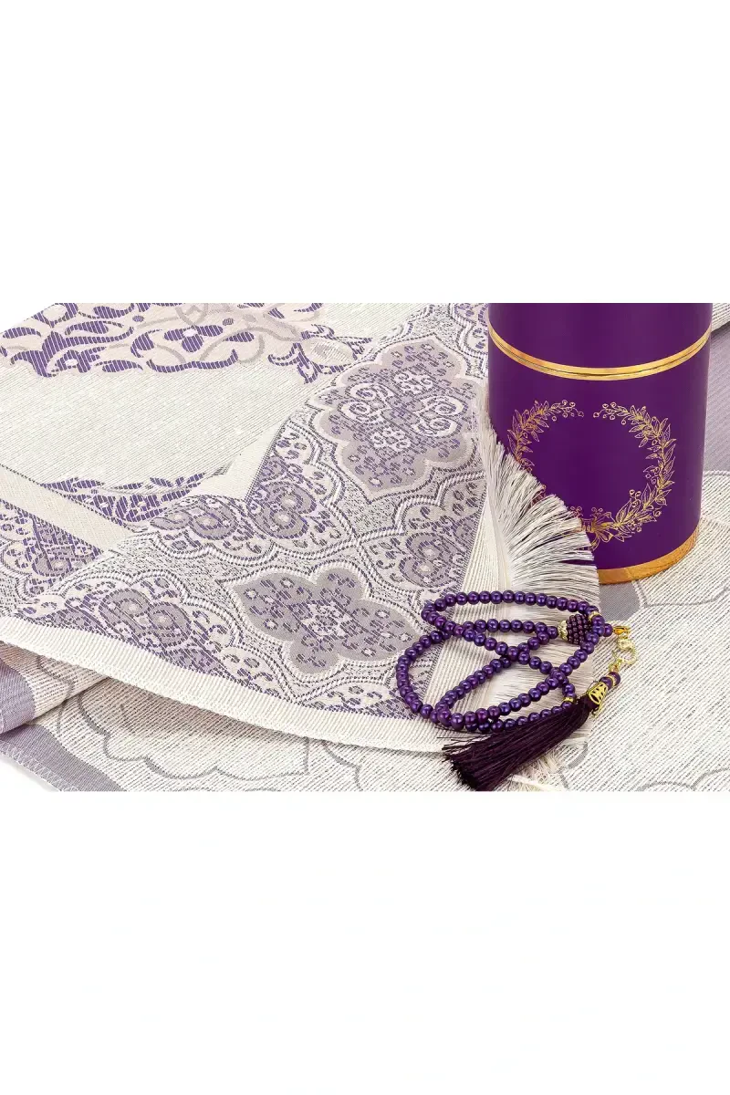 Bu özel set, günlük kullanımın yanı sıra özel günlerde hediye olarak da tercih edilebilir. Seccadenin pamuklu yapısı, kolay temizlenebilme özelliği sunarken, silindir kutusu da setin güvenli bir şekilde saklanmasını sağlar. Mor rengin huzur veren etkisiyle birleşen bu set, manevi atmosferinizi zenginleştirecek ve sevdiklerinize unutulmaz bir hediye deneyimi yaşatacaktır.