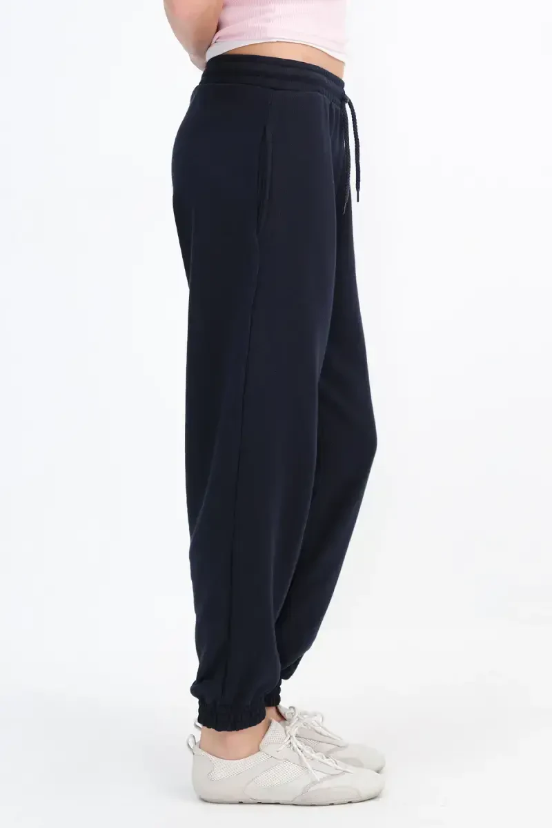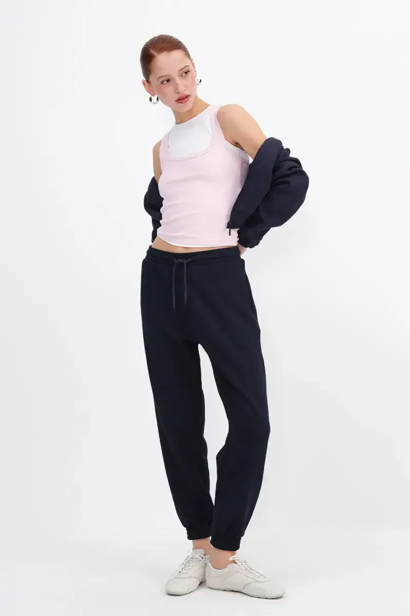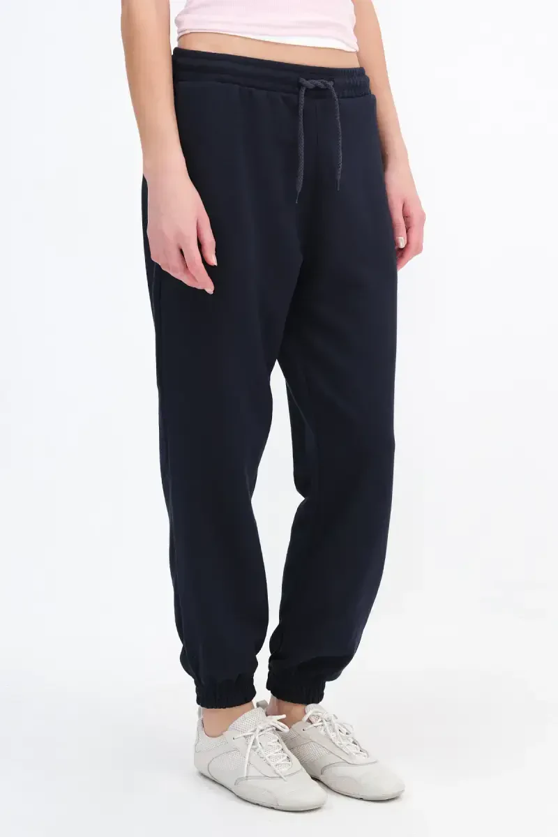 Paçası lastikli eşofman, rahat eşofman, lacivert eşofman, pamuklu eşofman, spor eşofman, günlük eşofman, lastikli paça, rahat kesim, kadın eşofman, eşofman takımı