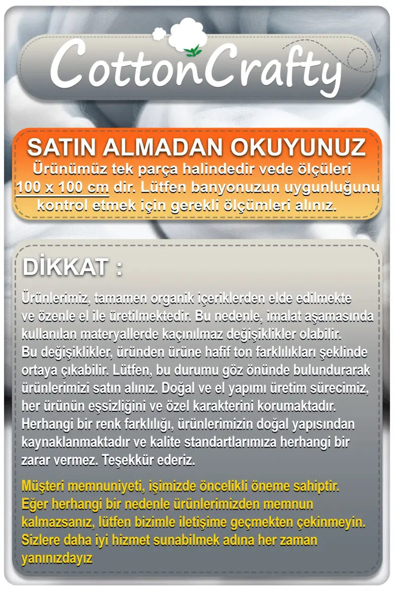 Bu ürün COTTON CRAFTY tarafından gönderilecektir.Kampanya fiyatından satılmak üzere 10 adetten fazla stok sunulmuştur.Bir ürün, birden fazla satıcı tarafından satılabilir. Birden fazla satıcı tarafından satışa sunulan ürünlerin satıcıları ürün için belirledikleri fiyata, satıcı puanlarına, teslimat statülerine, ürünlerdeki promosyonlara, kargonun bedava olup olmamasına ve ürünlerin hızlı teslimat ile teslim edilip edilememesine, ürünlerin stok ve kategorileri bilgilerine göre sıralanmaktadır.Bu üründen en fazla 10 adet sipariş verilebilir. 10 adedin üzerindeki siparişleri Trendyol iptal etme hakkını saklı tutar. Belirlenen bu limit kurumsal siparişlerde geçerli olmayıp, kurumsal siparişler için farklı limitler belirlenebilmektedir.15 gün içinde ücretsiz iade. Detaylı bilgi için [page="return_conditions"]tıklayın .- %100 pamuk ve polyester karışımı materyalden üretilmiş olup, dayanıklılığı ve konforu bir arada sunar.- Makine veya elde yıkama imkanıyla kolayca temizlenebilirböylece hijyenik bir kullanım sağlar.- Kurutucuda kurutulabilme özelliği sayesinde hızlı ve pratik bir şekilde kuruyarak zaman kazandırır.- Türkiye menşeli olmasıyla yerel kaynakların etkin kullanımı ve sürdürülebilirlik vurgusu yapar.- 12 mm'den kalın hav yüksekliği ile ayaklarınızın altında yumuşaklık hissi verirken aynı zamanda ekstra emicilik sunar.- Tek parça halinde gelen bu banyo paspası, 100x100 cm. boyutlarıyla ideal ölçülerde tasarlanmıştır.- Pamuklu yapısı sayesinde suyu hızla emer ve çabuk kurur, böylece banyonuzda rahatlıkla kullanabilirsiniz.