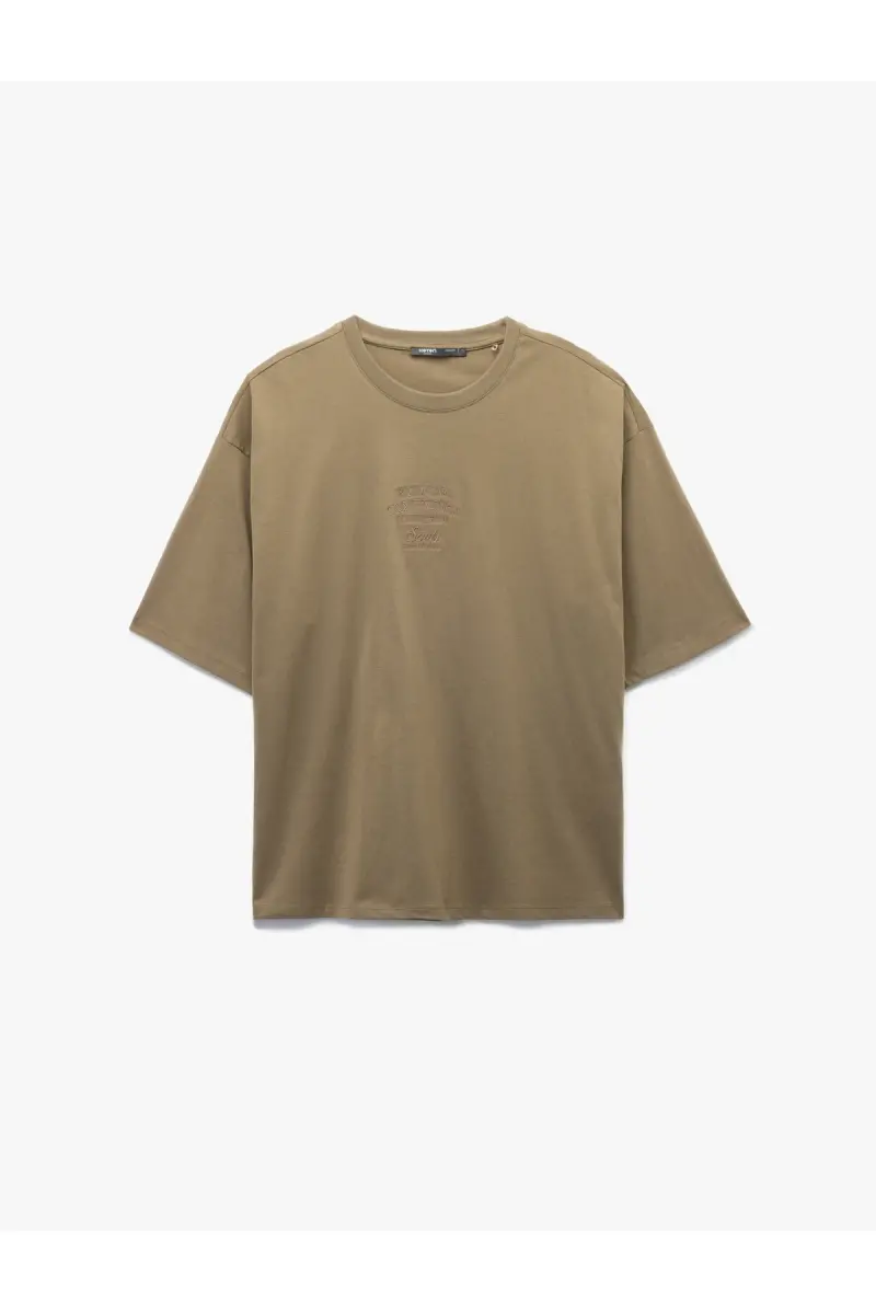 Pamuklu Bisiklet Yaka Tok Kumaş Slogan İşlemeli Kısa Kollu Oversize Tişört-Haki