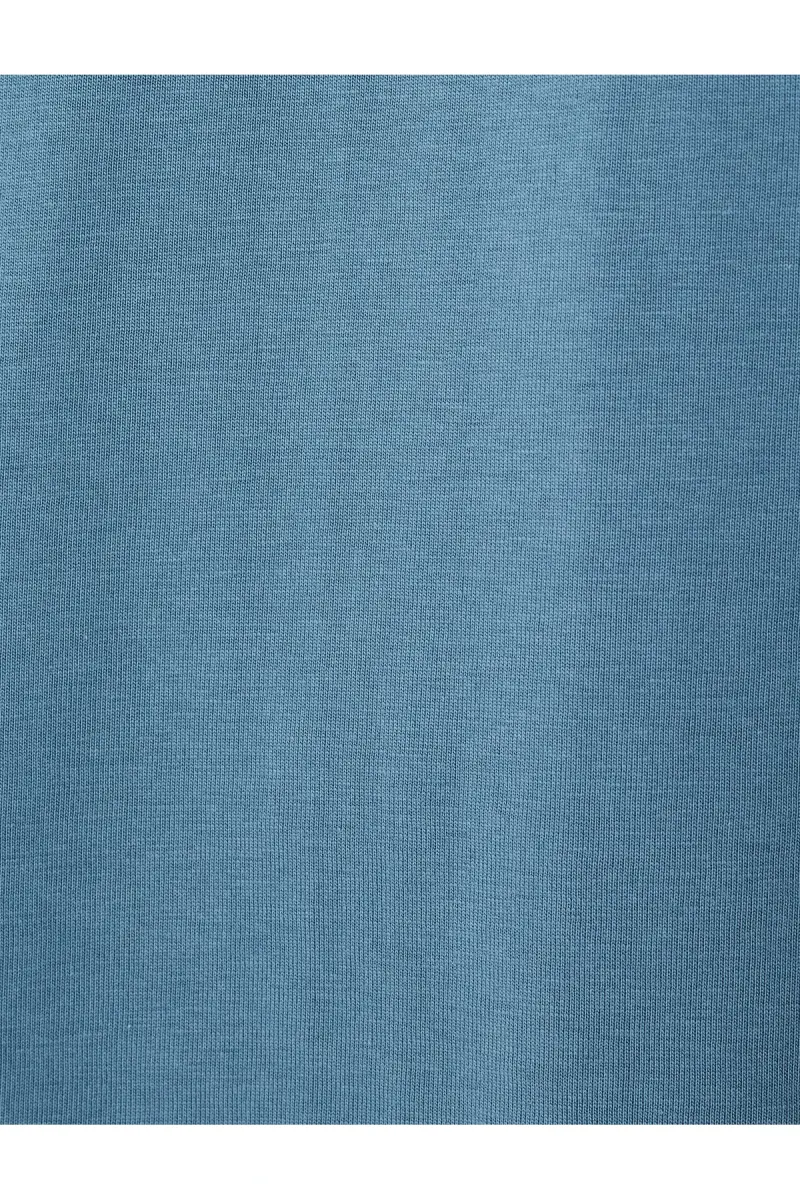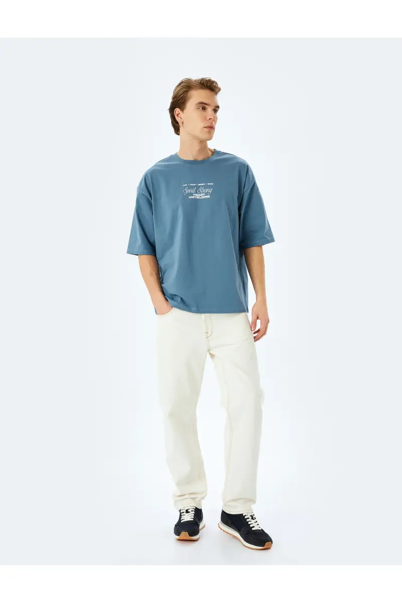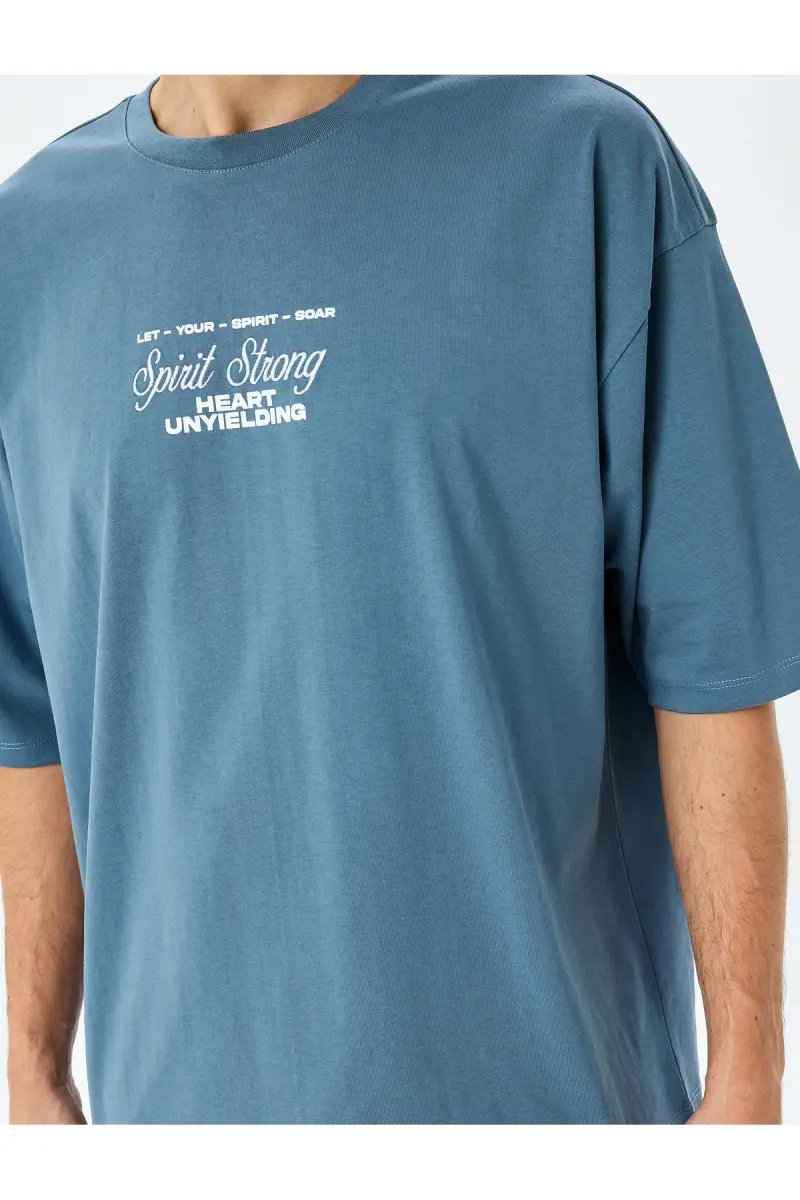 Pamuklu Tok Kumaş Kısa Kollu Bisiklet Yaka Slogan Baskılı Oversize Tişört-Mavi