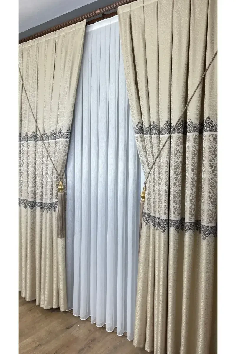 Panel curtain, backdrop curtain, cream beige curtain, single panel curtain, tightly pleated curtain, jacquard curtain, semi-gloss curtain, patterned curtain, 100x260 curtain, living room curtain