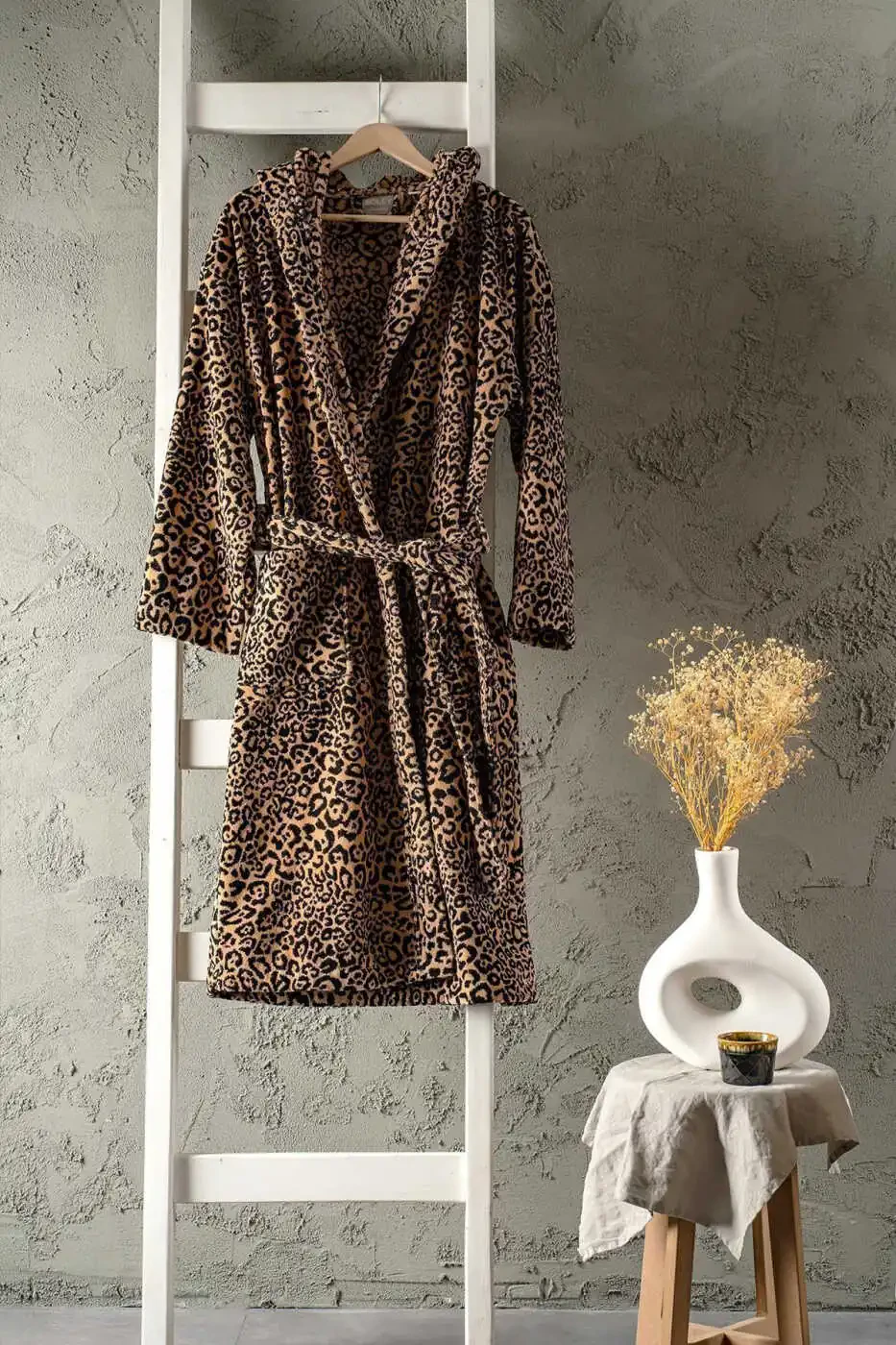 Ёввойи табиатнинг буюклиги ва ҳашаматнинг қулайлигини бирлаштирган Panthera 100% пахтадан тикилган леопард нақшли велюр халат билан ўзингизни эркалатинг! Бу ўзига хос дизайндаги халат аёллар ва эркакларга ҳам манзур бўлган нафис леопард нақши билан ҳаммомга экзотик муҳит бағишласа, бетакрор қулайлиги билан сизни мафтун этади. Премиум сифатли 100% пахта велюр матодан тайёрланган Panthera юмшоқ тузилиши ва аъло сифатли нам тортиши билан узоқ муддатли фойдаланиш учун идеал танловдир. Капюшони туфайли ҳам илиқлик бағишлайди, ҳам чиройингизга чирой қўшади. OEKO-TEX® 100 стандартига мувофиқ равишда ишлаб чиқарилган Panthera зарарли моддалардан холи ва экологик тозадир. Сизни кундалик ҳаёт ташвишларидан узоқлаштириб, ўзингизни мукофотлаш ва дам олишингизни таъминловчи бетакрор тажрибани тақдим этади. 420 г/м² оғирлиги билан сифатини ҳис қиласиз. Фақат халат эмас, балки ўзингизга берган қадрият рамзи бўлган Panthera билан ҳар бир душдан кейин ўзингизни подшоҳ оиласи аъзосидек ҳис қиласиз. Чегарасиз қулайлик ва чиройни бир вақтда бошидан кечиринг!