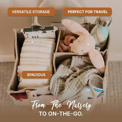 VERSATILE NURSERY STORAGE SOLUTION: The Parker Baby Diaper Caddy Organizer is a patented organizer designed for all your baby essentials. It accommodates diapers, wipes, clothes, toys, changing pads, and more. The removable organizer insert allows it to double as a toy storage bin or nursery basket. STYLISH AND PRACTICAL DESIGN: Complement your nursery decor with our neutral diaper organizer. Its sleek and functional design looks great on changing tables, dressers, or beside diaper pails. The caddy features sturdy outer pockets for additional baby storage, keeping everything within easy reach during diaper changes. PORTABLE AND CONVENIENT: With a long, durable handle, this lightweight changing table organizer is easy to move around. Use it as a car caddy or car organizer, making on-the-go parenting a breeze. Store breast pump and accessories, baby bath products, or keep it bedside for convenient access during late-night feedings. It's the perfect companion for your parenting journey. MULTIPURPOSE BABY SHOWER GIFT: The Parker Baby caddy makes a thoughtful and practical baby shower gift. It's an essential item for every baby registry, offering new parents a stylish and organized solution for diaper changing. Give the gift of convenience and style to expecting parents. QUALITY AND SATISFACTION GUARANTEE: Crafted from soft felt, our diaper caddy is built to last. The high-quality materials ensure durability and easy maintenance. We stand behind the product with a satisfaction guarantee, making your purchase risk-free. Elevate your diaper organization with the Parker Baby Diaper Caddy – the ultimate diaper bag essential and nursery organizer.