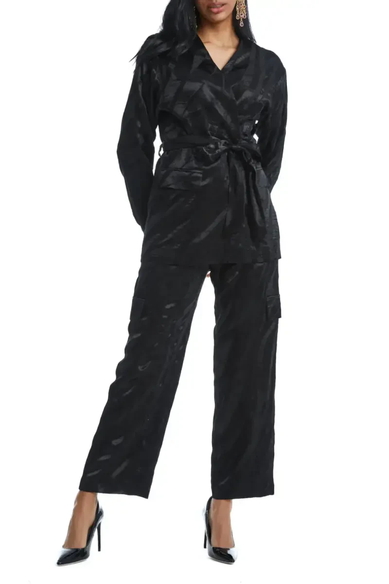 Parlak Desenli Kuşaklı Asimetrik Ceketli Siyah Takım