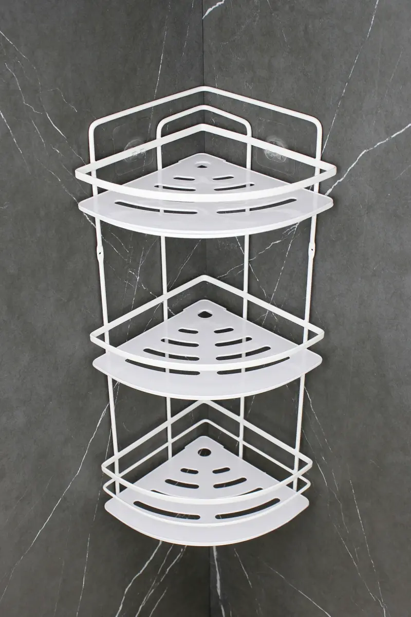Paslanmaz Kristal Raflı Beyaz Lamalı Üçlü Şampuanlık Yapışkanlı Banyo Düzenleyici Köşeliği Rafı-BEYAZ