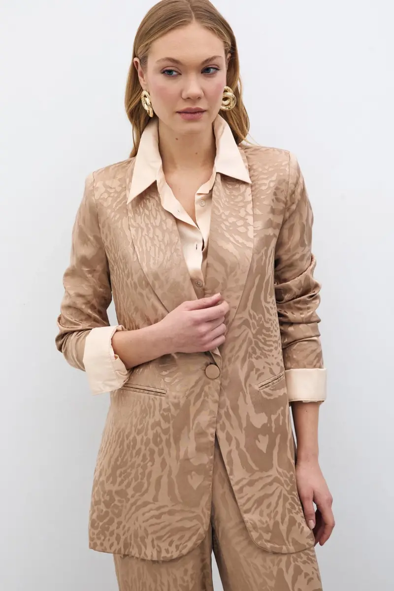 Patterned Satin Jacket - Mink color is a special design that combines elegance and comfort. Thanks to its light satin fabric, it offers comfort throughout the day, while its patterned structure allows you to add originality to your style. It is an ideal option for both daily use and special occasions.**Product Description**Patterned Satin Jacket - Mink is a candidate to be one of the indispensable pieces of your wardrobe. This unique design ensures you stand out in any environment with its modern and elegant appearance. The warm tone of the mink color easily adapts to different combinations, highlighting your style. The light satin fabric of the jacket offers a pleasant touch to your skin and provides a comfortable wearing experience throughout the day. Its patterned structure adds movement and dynamism to the jacket, allowing you to move away from the ordinary. Whether you create a daily combination with jeans or attend a special occasion with a stylish dress, the Patterned Satin Jacket - Mink will always add a perfect touch to your style. The cut of the jacket helps you achieve a more fit look by gently emphasizing your body lines. In addition, the button details on the front of the jacket add a different elegance to the design while also providing ease of use. Patterned Satin Jacket - Mink is not just a jacket, but also a style statement. Reflect your style with this special design and make a difference in every environment. Get ready to be the most loved piece of your wardrobe! Patterned Satin Jacket - Mink stands out not only with its elegance, but also with its ease of use and durability. Its quality satin fabric offers long-lasting use, while its easy-to-clean feature makes it a practical option. The stitching details of the jacket are made with meticulous workmanship and increase the overall quality of the jacket. Thanks to this, the Patterned Satin Jacket - Mink will continue to be one of the most valuable pieces of your wardrobe for many years. Whether it is a lifesaver for cool evenings in the spring months, or a piece that completes your style in the autumn months, the Patterned Satin Jacket - Mink is a versatile option that you can use in any season. You can personalize your style by combining it with different accessories and always achieve a unique and stylish look. Take your style to the next level with the Patterned Satin Jacket - Mink and make a difference in every environment!**Product Features*** Light satin fabric* Patterned design* Mink color* Suitable for daily and special occasions* Comfortable fit**Additional Information**The model is wearing size S/36. Product content is 100% polyester. Can be washed in the machine at 30 degrees. May require ironing.