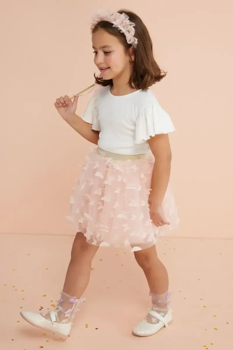 This cute skirt, designed to color your little princess's wardrobe and make her stand out in style, features three-dimensional butterfly details. The inner lining is made of 100% cotton, designed with delicate skin in mind. The tulle that gives the skirt its elegant look is 100% polyester.