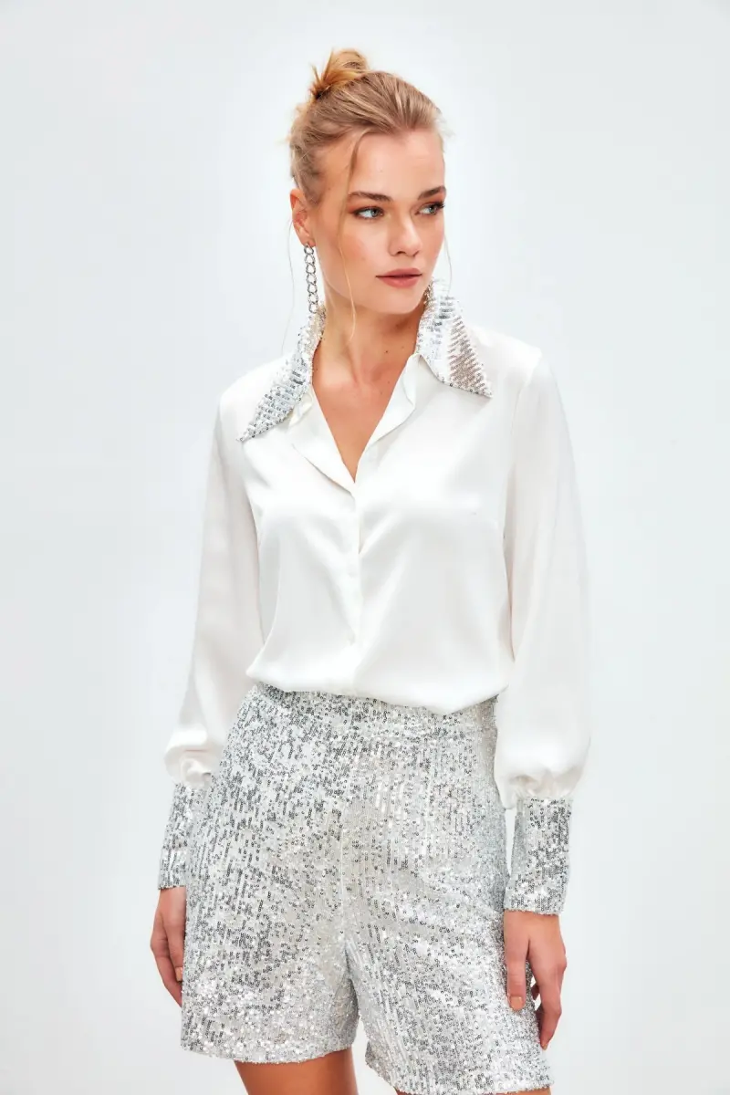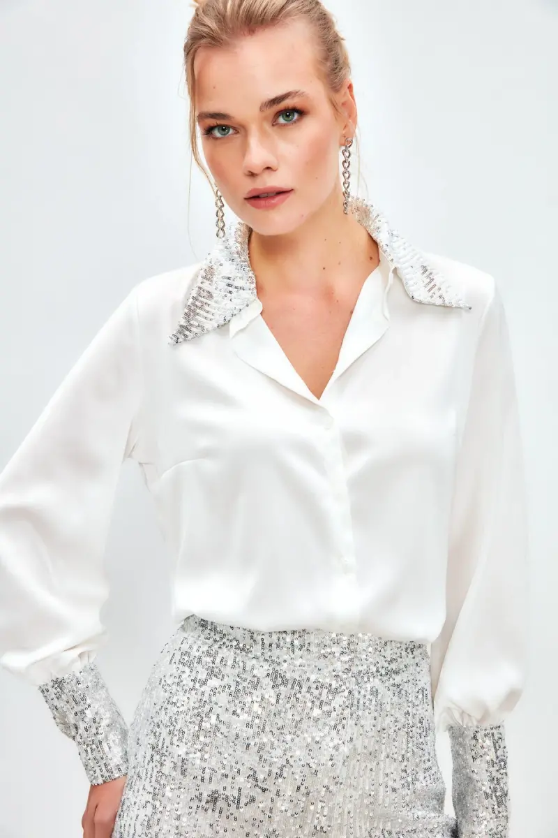 Payet Detaylı Saten Gömlek - Ekru-EKRU