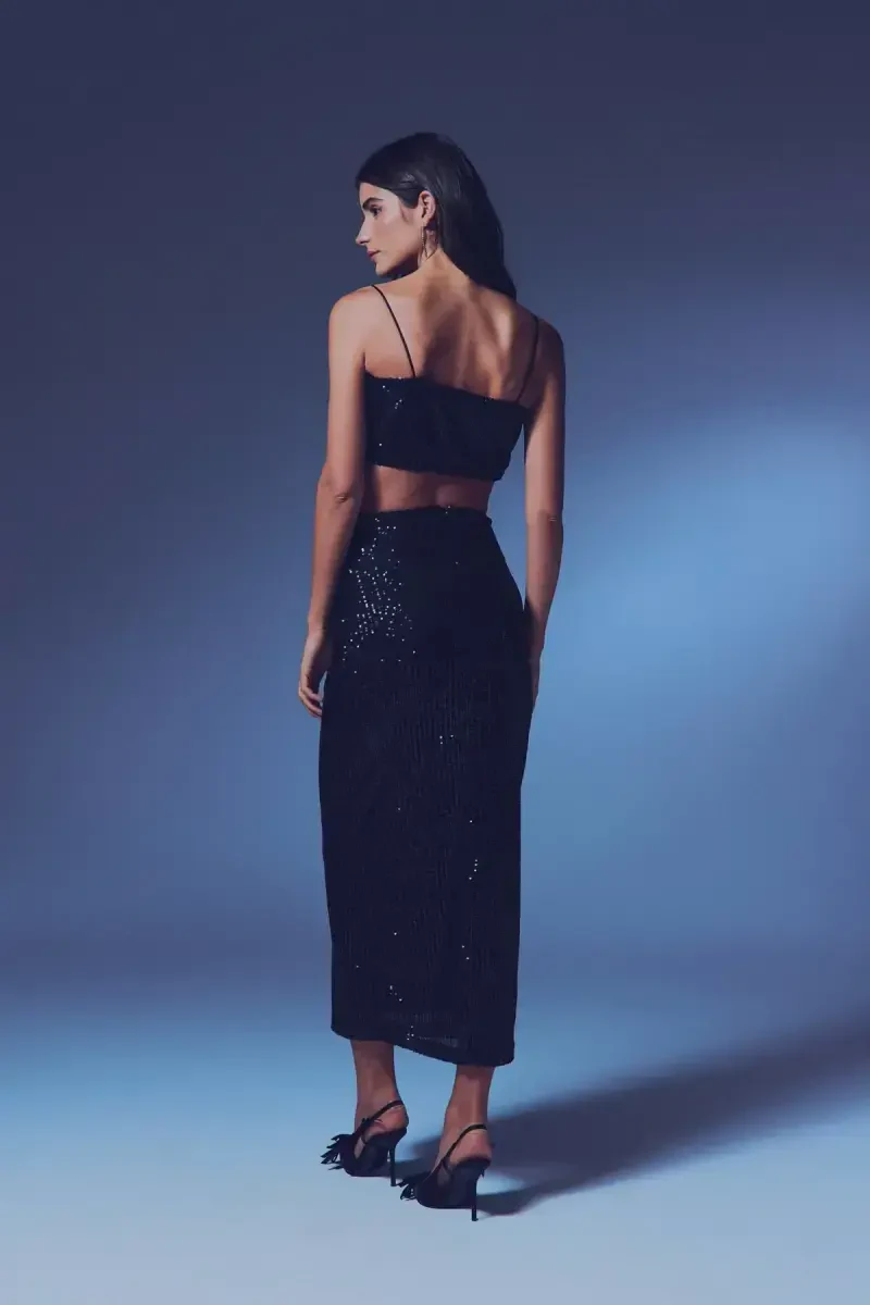 Легко тянущаяся талия, задняя молния, подкладка, эластичная, длинная юбка с пайетками. Длина: 102 см. Товар на манекене - размер 36/S. Параметры модели: Рост: 1,76, Бюст: 83, Талия: 60, Бедра: 90