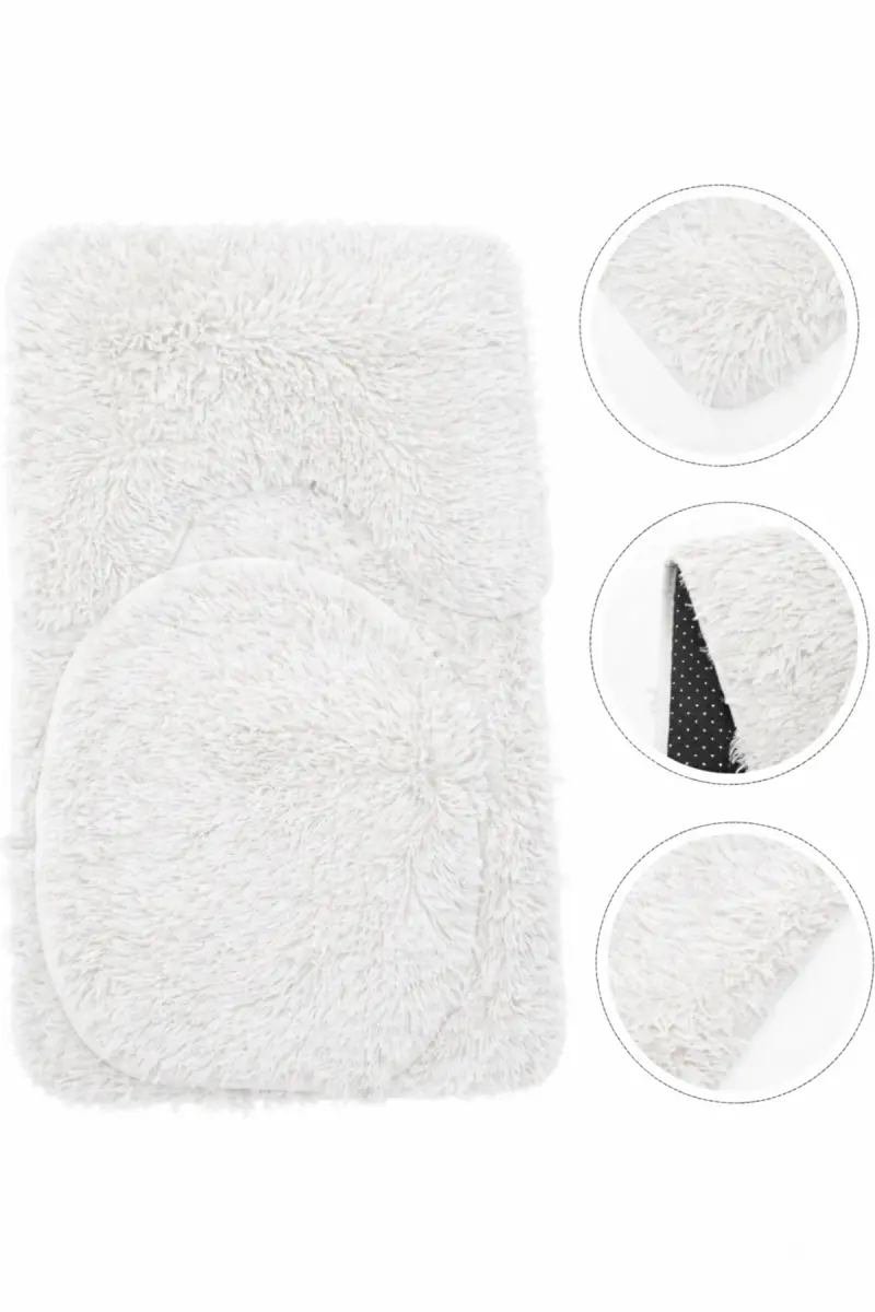 Peluş Kaymaz Yıkanabilir Banyo Paspası Klozet Takımı 3'Lü 50x80/50x60/40x45(klozt kapağı)-Beyaz
