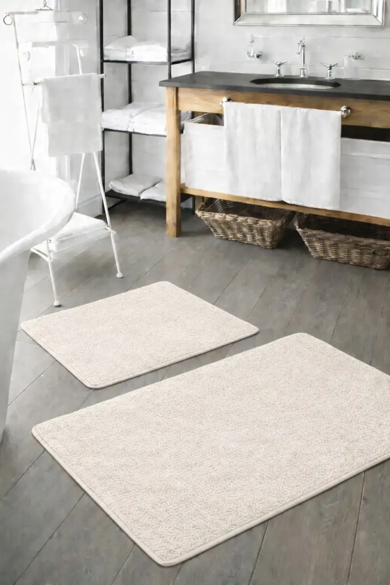 Peluş Yıkanabilir Ekru Kaymaz Taban 2'li Banyo Paspası Takımı (50X80 50X40)-Ekru