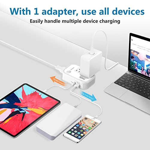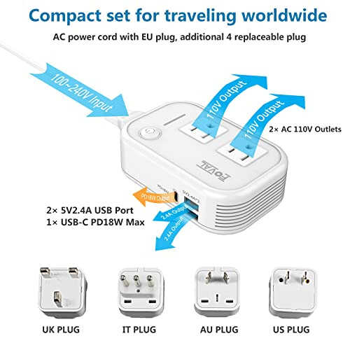 FOVAL Переходник для путешествий 220 В - 110 В: Улучшенный международный понижающий преобразователь напряжения для выпрямителя/плойки для волос с портом USB-C 18 Вт